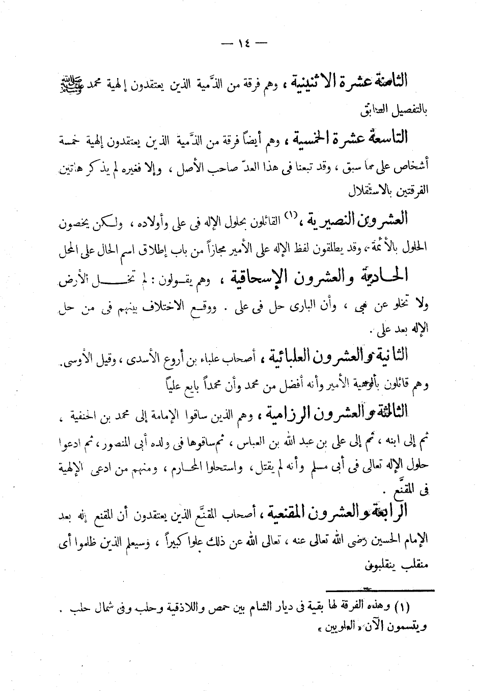 العشرون النصيرية: (¬3) القائلون بحلول الإله في عليّ وأولاده، ولكن يخصون الحلول بالأئمة، وقد يطلقون لفظ الإله على الأمير مجازا من باب إطلاق اسم الحال على المحل. (¬4)
