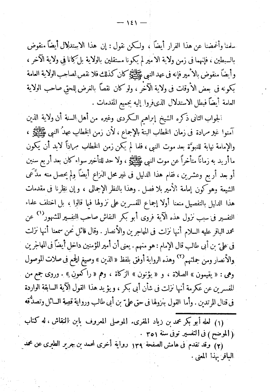 الجواب الثاني ذكره الشيخ إبراهيم الكردي (¬1) وغيره من أهل السنة أن ولاية الذين آمنوا غير مرادة في زمان الخطاب البتة بالإجماع، لأن زمن الخطاب عهد النبي - صلى الله عليه وسلم - والإمامة نيابة للنبوة بعد موت النبي، فلما لم يكن زمن الخطاب مرادا لا بد أن يكون ما أريد به زمانا متأخرا عن موت النبي - صلى الله عليه وسلم -، ولا حد للتأخير سواء كان أربع سنين أو بعد أربع وعشرين، فقام هذا الدليل في غير محل النزاع ولم يحصل منه مدعى الشيعة وهو كون إمامة الأمير بلا فصل. وهذا بالنظر الإجمالي، وإن نظرنا في مقدمات هذا الدليل بالتفصيل منعنا أولا إجماع المفسرين على نزولها فيما قالوا، بل اختلف علماء التفسير في سبب نزول هذه الآية فروى أبو بكر النقاش (¬2) صاحب التفسير المشهور عن محمد الباقر - عليه السلام - أنها نزلت في المهاجرين والأنصار. وقال قائل نحن سمعنا أنها نزلت في علي بن أبي طالب قال الإمام: هو منهم. (¬3) يعني أن أمير المؤمنين داخل أيضا في المهاجرين والأنصار ومن جملتهم. وهذه الرواية أوفق بلفظ «الذين» وصيغ الجمع في صلات الموصول وهي: {يقيمون الصلاة ويؤتون الزكاة وهم راكعون}. وروى جمع من المفسرين عن عكرمة أنها نزلت في شأن أبي بكر، ويؤيد هذا القول الآية السابقة الواردة في قتال المرتدين. وأما القول بنزولها في حق علي بن أبي طالب ورواية قصة السائل وتصدقه
