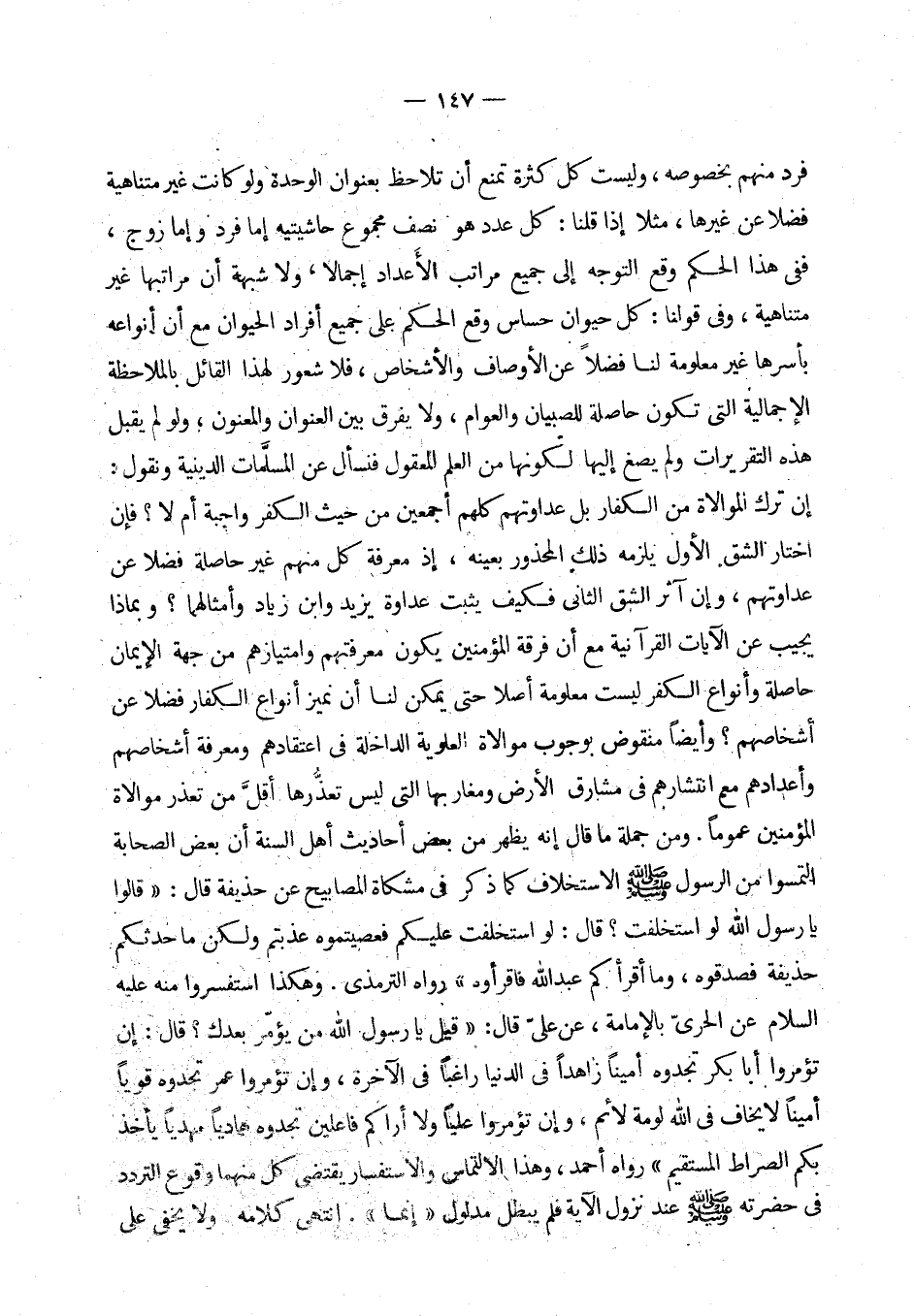 فرد منهم بخصوصه وليست كل كثرة تمنع أن تلاحظ بعنوان الوحدة ولو كانت غير متناهية فضلا عن غيرها. مثلا إذا قلنا: كل عدد هو نصف مجموع حاشيتيه إما فرد وإما زوج ففي هذا الحكم وقع التوجه إلى جميع مراتب الأعداد إجمالا ولا شبهة أن مراتبها غير متناهية. وفي قولنا: كل حيوان حساس وقع الحكم على جميع أفراد الحيوان مع أن أنواعه بأسرها غير معلومة لنا فضلا عن الأوصاف والأشخاص. فلا شعور لهذا القائل بالملاحظة الإجمالية التي تكون حاصلة للصبيان والعوام ولا يفرق بين العنوان والمعنون. ولو لم يقبل هذه التقريرات ولم يضع إليها لكونها من العلم المعقول فنسأل عن المسلمات الدينية ونقول: إن ترك الموالاة من الكفار بل عداوتهم كلهم أجمعين من حيث الكفر واجبة أم لا؟ فإن اختار الشق الأول يلزمه ذلك المحذور بعينه إذ معرفة كل منهم غير حاصلة فضلا عن عداوتهم وإن آثر الشق الثاني فكيف يثبت عداوة يزيد وابن زياد وأمثالهما؟ وبماذا يجيب عن الآيات القرآنية مع أن فرقة المؤمنين يكون معرفتهم وامتيازهم من جهة الإيمان حاصلة وأنواع الكفر ليست معلومة أصلا حتى يمكن لنا أن نميز أنواع الكفار فضلا عن أشخاصهم؟ وأيضا منقوض بوجوب موالاة العلوية الداخلة في اعتقادهم ومعرفة أشخاصهم وأعدادهم مع انتشارهم في مشارق الأرض ومغاربها التي ليس تعذرها أقل من تعذر موالاة المؤمنين عموما.