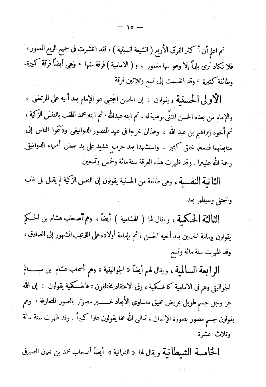 ثم اعلم أن أكثر الفرق الأربع الشيعة السبية، فقد انتشرت في جميع الربع المعمور، فلا تكاد ترى بلدا إلا وهو بها مغمور، والإمامية فرقة منها، وهي أيضا فرقة كبيرة وطائفة كثيرة، وقد انقسمت إلى تسع وثلاثين فرقة.