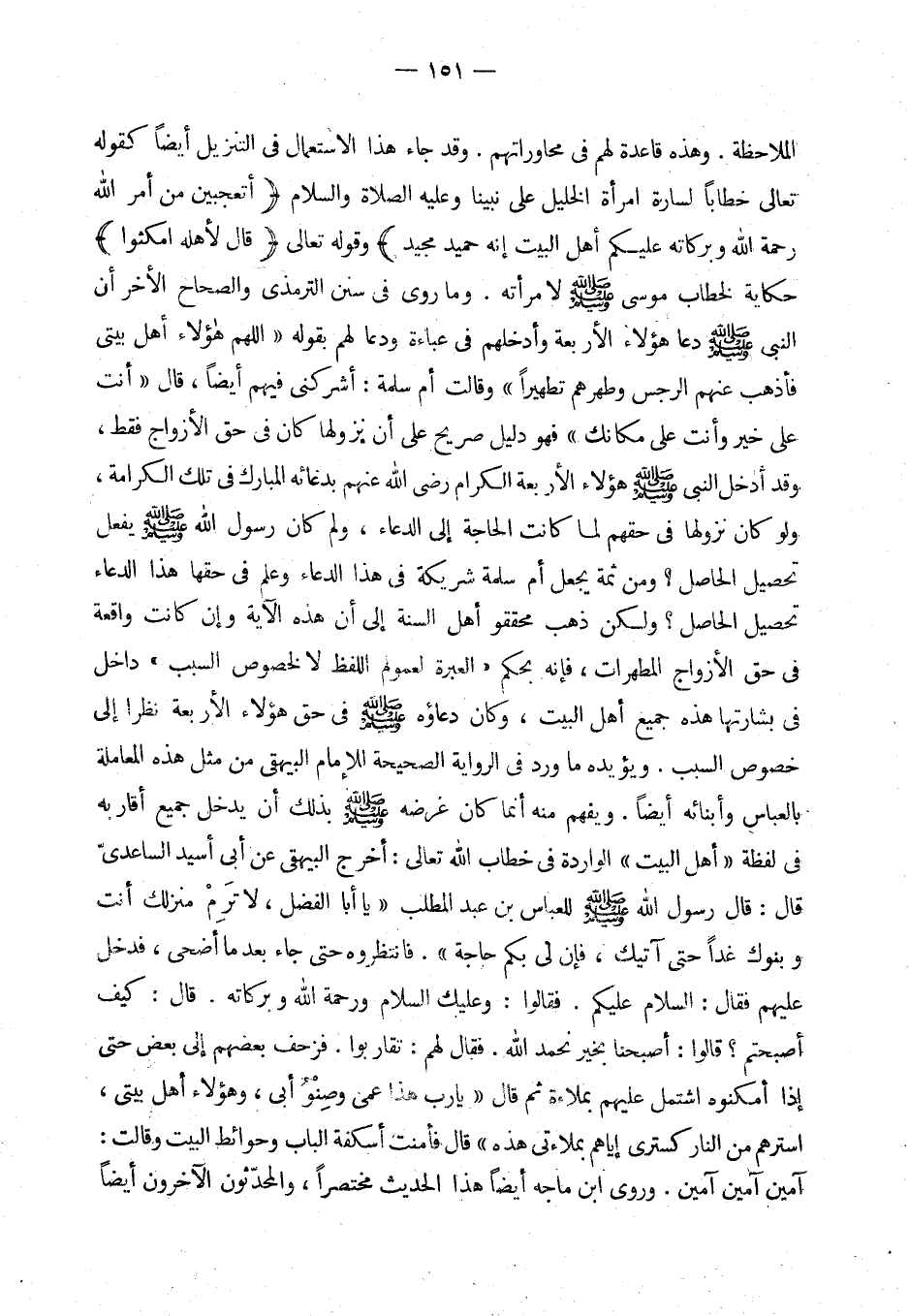 الملاحظة وهذه قاعدة لهم في محاوراتهم وقد جاء هذا الاستعمال في التنزيل أيضا كقوله تعالى خطابا لسارة امرأة الخليل على نبينا وعليه الصلاة والسلام: {أتعجبين من أمر الله رحمة الله وبركاته عليكم أهل البيت إنه حميد مجيد} وقوله {قال لأهله امكثوا} حكاية لخطاب موسى - صلى الله عليه وسلم - لامرأته. وما روي في سنن الترمذي والصحاح الأخر أن النبي - صلى الله عليه وسلم - دعا هؤلاء الأربعة وأدخلهم في عباءة ودعا لهم بقوله «اللهم هؤلاء أهل بيتي فأذهب عنهم الرجس وطهرهم تطهيرا» وقالت أم سلمة: أشركني فيهم أيضا، قال «أنت على خير وأنت على مكانك». (¬1) فهو دليل صريح على أن نزولها كان في حق الأزواج فقط وقد أدخل النبي - صلى الله عليه وسلم - هؤلاء الأربعة - رضي الله تعالى عنهم - بدعائه المبارك في تلك الكرامة ولو كان نزولها في حقهم لما كانت الحاجة إلى الدعاء، ولم كان رسول الله - صلى الله عليه وسلم - يفعل تحصيل الحاصل؟ ومن ثمة يجعل أم سلمة شريكة في هذا الدعاء وعلم في حقها هذا الدعاء تحصيل الحاصل؟ ولكن ذهب محققو أهل السنة إلى أن هذه الآية وإن كانت واقعة في حق الأزواج المطهرات فإنه بحكم «العبرة لعموم اللفظ لا لخصوص السبب» (¬2)