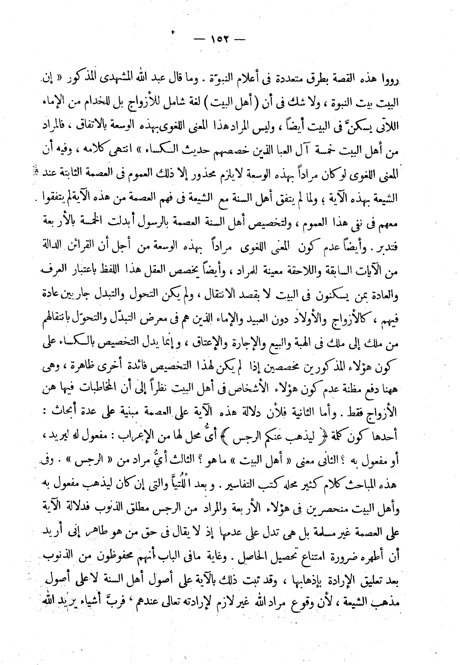 وبعد اللتيا (¬4) والتي إن كان ليذهب مفعول به وأهل البيت منحصرين في هؤلاء الأربعة والمراد من الرجس مطلق الذنوب فدلالة الآية على العصمة غير مسلمة بل هي تدل على عدمها إذ لا يقال في حق من هو طاهر إني أريد أن أطهره ضرورة امتناع تحصيل الحاصل. وغاية ما في الباب أنهم محفوظون من الذنوب بعد تعليق الإرادة بإذهابها، قد ثبت ذلك بالآية على أصول أهل السنة لا على أصول مذهب الشيعة، لأن وقوع مراد الله لزم إرادته تعالى عندهم: فرب أشياء يريد الله