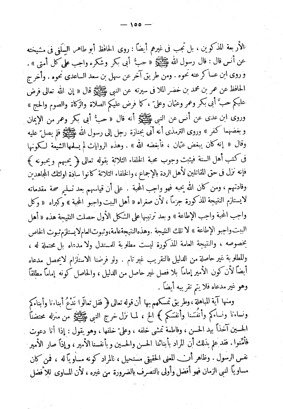 ومنها آية المباهلة، وطريق تمسكهم بها أن قوله تعالى {فقل تعالوا ندع أبناءنا وأبناءكم ونساءنا ونساءكم وأنفسنا وأنفسكم} الخ، لما نزل خرج النبي - صلى الله عليه وسلم - من منزله محتضنا الحسين آخذا بيد الحسن وفاطمة تمشى خلفه وعلي خلفها وهو يقول: إذا أنا دعوت فأمّنوا. (¬7) فقد علم بذلك أن المراد بأبنائنا الحسن والحسين وبأنفسنا الأمير، وإذا صار الأمير نفس الرسول. وظاهر أن المعنى الحقيقي مستحيل، فالمراد كونه مساويا له، فمن كان مساويا لنبي الزمان فهو أفضل وأولى بالتصرف بالضرورة من غيره، لأن المساوي للأفضل
