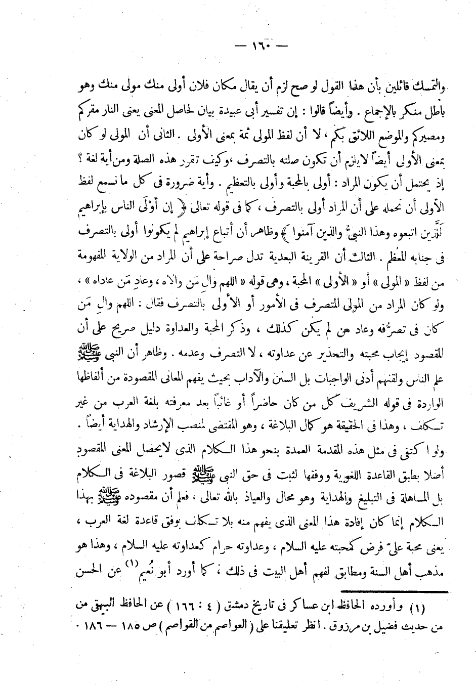 والتمسك قائلين بأن هذا القول لو صح لزم أن يقال مكان فلان أولى منك مولى منك، وهو باطل منكر بالإجماع. وأيضا قالوا: إن تفسير أبي عبيدة بيان الحاصل لمعنى يعني النار مقركم ومصيركم والموضع اللائق بكم، لا أن اللفظ المولى ثمة بمعنى الأولى. (¬1) الثاني أن المولى لو كان بمعنى الأولى أيضا لا يلزم أن تكون صلته بالتصرف، كيف تقرر الصلة ومن أية لغة؟ إذ يحتمل أن يكون المراد: أولى بالتصرف، كما في قوله تعالى {إن أولى الناس بإبراهيم للذين اتبعوه وهذا النبي والذين آمنوا} وظاهر أن أتباع إبراهيم لم يكونوا أولى بالتصرف في جنابه المعظم. الثالث أن القرينة البعدية تدل صراحة على أن المراد من الولاية المفهومة من لفظ «المولى» أو «الأولى» المحبة، وهي قوله «اللهم وال من والاه، وعاد من عاداه»، ولو كان المراد من المولى المتصرف في الأمور أو الأولى بالتصرف فقال: اللهم وال من كان في تصرفه وعاد من لم يكن كذلك، وذكر المحبة والعداوة دليل صريح على أن المقصود إيجاب محبته والتحذير عن عداوته، لا التصرف وعدمه. وظاهر أن النبي - صلى الله عليه وسلم - علم الناس ولقنهم أدنى الواجبات بل السنن والآداب بحيث يفهم المعاني المقصودة من ألفاظها الواردة في قوله الشريف كل من كان حاضرا أو غائبا بعد معرفته بلغة العرب من غير تكلف، وهذا في الحقيقة هو كمال البلاغة، وهو المقتضى لمنصب الإرشاد والهداية أيضا. ولو اكتفى في مثل هذه المقدمة العمدة بنحو هذا الكلام الذي لا يحصل المعنى المقصود أصلا بطبق القاعدة اللغوية ووفقها لثبت في حق النبي - صلى الله عليه وسلم - قصور البلاغة في الكلام بل المساهمة في التبليغ والهداية وهو محال والعياذ بالله تعالى، فعلم أن مقصوده - صلى الله عليه وسلم - بهذا يعني محبة علي فرض كمحبته - عليه السلام -، وعداوته حرام كعداوته - عليه السلام -، وهذا هو مذهب أهل السنة ومطابق لفهم أهل البيت في ذلك، كما أورد أبو نعيم عن الحسن