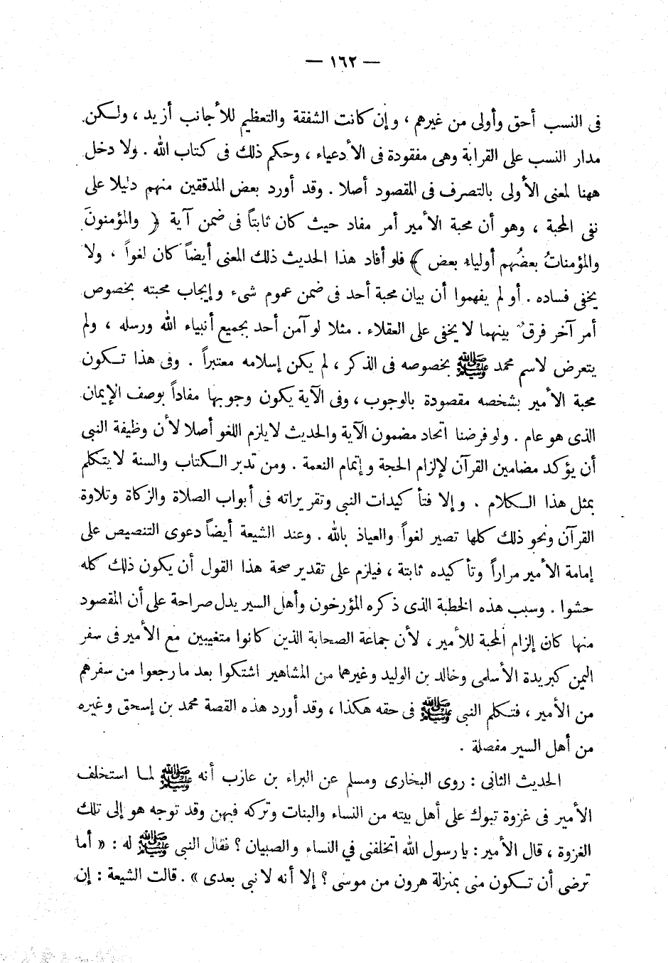 الحديث الثاني: روى البخاري ومسلم عن البراء بن عازب أنه - صلى الله عليه وسلم - لما استخلف الأمير في غزوة تبوك على أهل بيته من النساء وتركه فيهن وقد توجه هو إلى تلك الغزوة، قال الأمير: يا رسول الله أتخلِفني في النساء والصبيان؟ فقال النبي - صلى الله عليه وسلم - له: «أما ترضى أن تكون مني بمنزلة هرون من موسى إلا أنه لا نبي بعدي». (¬5) قالت الشيعة: إن