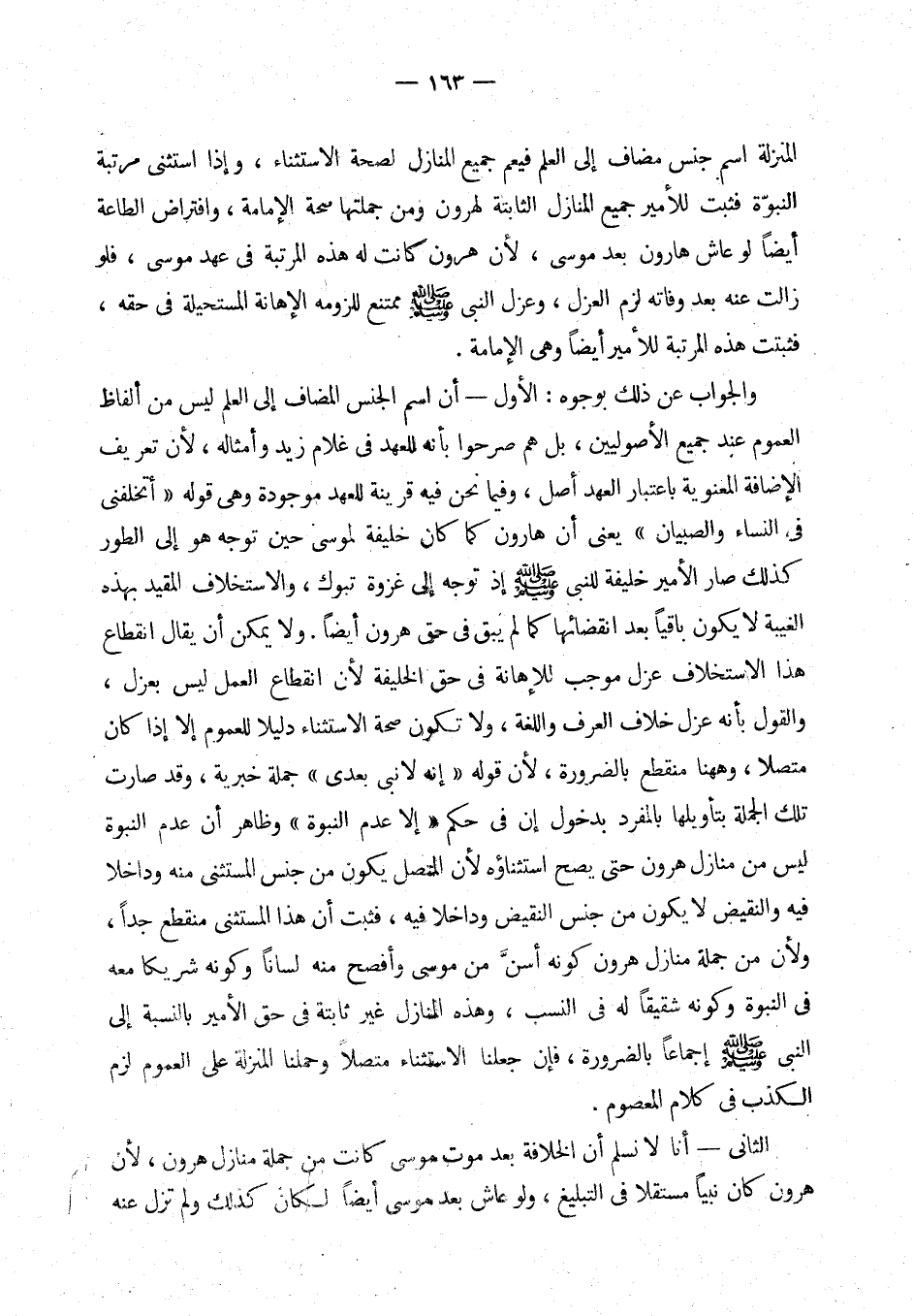 المنزلة اسم جنس مضاف إلى العلم فيعم جميع المنازل لصحة الاستثناء، وإذا استثني مرتبة النبوة فثبت للأمير جميع المنازل الثابتة لهارون، ومن جملتها صحة الإمامة، وافتراض الطاعة أيضا لو عاش هارون بعد موسى، لأن هارون كانت له هذه المرتبة في عهد موسى، فلو زالت عنه بعد وفاته لزم العزل، وعزل النبي - صلى الله عليه وسلم - ممتنع للزومه الإهانة المستحيلة في حقه فثبتت هذه المرتبة للأمير أيضا وهي الإمامة. (¬1)
