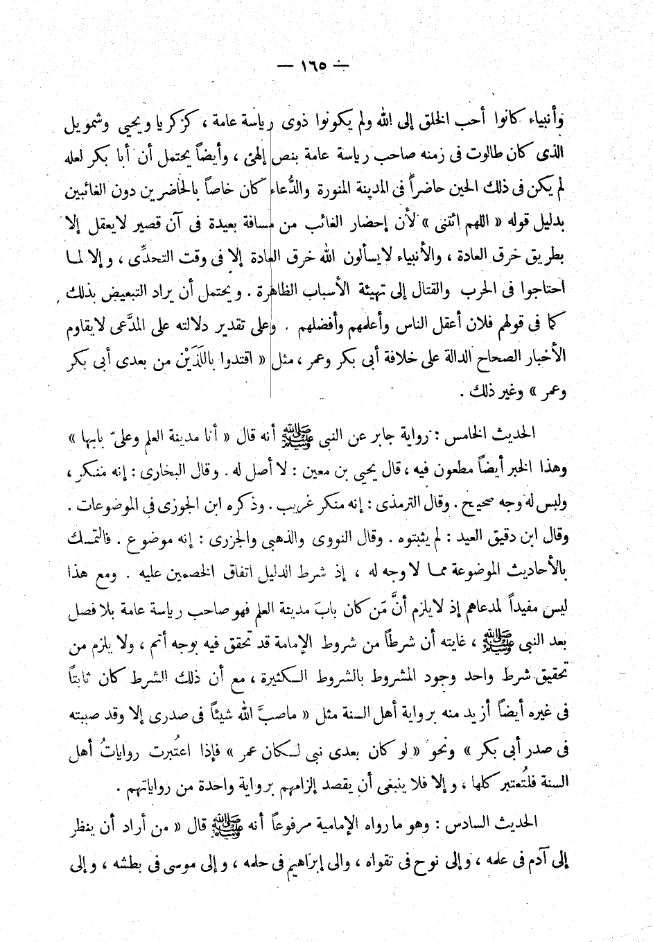 الحديث الخامس: رواية جابر عن النبي - صلى الله عليه وسلم - أنه قال: «أنا مدينة العلم وعلي بابها» (¬2) وهذا الخبر أيضا مطعون فيه، قال يحيى بن معين: لا أصل له، (¬3) وقال البخاري إنه منكر، وليس له وجه صحيح. (¬4) وقال الترمذي إنه منكر غريب. (¬5) وذكره ابن الجوزي في الموضوعات. (¬6) وقال ابن دقيق العيد: لم يثبتوه. (¬7) وقال النووي والذهبي والجزري إنه موضوع. (¬8) فالتمسك بالأحاديث الموضوعة مما لا وجه له، إذ شرط الدليل اتفاق الخصمين عليه. ومع هذا ليس مفيدا لمدعاهم إذ لا يلزم أن من كان باب مدينة العلم فهو صاحب رئاسة عامة بلا فصل بعد النبي - صلى الله عليه وسلم -، غايته أن شرطا من شروط الإمامة قد تحقق فيه بوجه أتم، ولا يلزم من تحقيق شرط واحد وجود المشروط بالشروط الكثيرة، مع أن ذلك الشرط كان ثابتا في غيره أيضا أزيد منه برواية أهل السنة مثل «ما صب الله شيئا في صدرى إلا وقد صببته في صدر أبي بكر» (¬9) ونحو «لو كان بعدي نبي لكان عمر» (¬10) فإذا اعتبرت روايات أهل السنة فليتعبر كلها، وإلا فلا ينبغي أن يقصد إلزامهم برواية واحدة من رواياتهم.