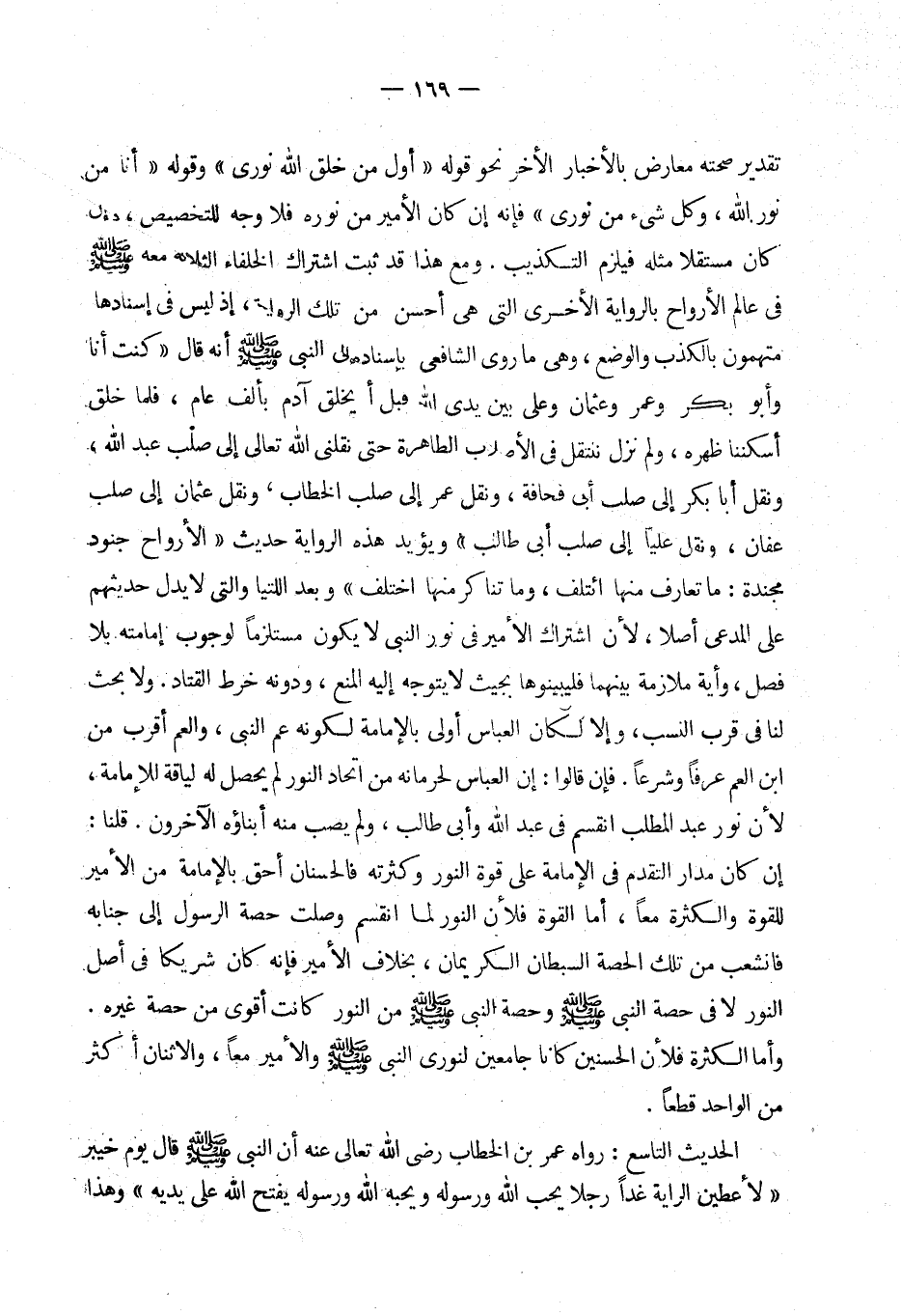 وبعد اللتيا والتي لا يدل حديثهم على المدعي أصلا لأن اشتراك الأمير في نور النبي لا يكون مستلزما لوجوب إمامته بلا فصل وأية ملازمة بينهما فليبينوها بحيث لا يتوجه إليه المنع ودونه خرط القتاد. ولا بحث لنا في قرب النسب وإلا لكان العباس أولى بالإمامة لكونه عم النبي والعم أقرب من ابن العم عرفا وشرعا. فإن قالوا إن العباس لحرمانه من اتحاد النور لم يحصل له لياقة للإمامة لأن نور عبد المطلب انقسم في عبد الله وأبي طالب ولم يصب أبناؤه الآخرون، قلنا: إن كان مدار التقدم في الإمامة على قوة النور وكثرته فالحسنان أحق بالإمامة من الأمير للقوة والكثرة معا. أما القوة فلأن النور لما انقسم وصلت حصة الرسول إلى جنابه فانشعب من تلك الحصة السبطان الكريمان بخلاف الأمير فإنه كان شريكا في أصل النور لا في حصة النبي - صلى الله عليه وسلم - وحصة النبي - صلى الله عليه وسلم - من النور كانت أقوى من حصة غيره. وأما الكثرة فلأن الحسنين كانا جامعين لنوري النبي - صلى الله عليه وسلم - والأمير معا والاثنان أكثر من الواحد قطعا.