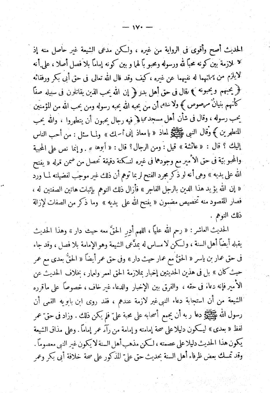 الحديث أصح وأقوى من غيره، ولكن مدعى الشيعة غير حاصل منه إذ لا ملازمة بين كونه محبا لله ورسوله ومحبوبا لهما وبين كونه إماما بلا فصل أصلا، على أنه لايلزم من إثباتهما له نفيا عن غيره، كيف وقد قال الله تعالى في حق أبي بكر ورفقائه {يحبهم ويحبونه} وقال في حق أهل بدر {إن الله يحب الذين يقاتلون في سبيله صفا كأنهم بنيان مرصوص} ولا شك أن من يحبه الله يحبه رسوله ومن يحب الله من المؤمنين يحب رسوله، وقال في شأن أهل مسجد قبا {فيه رجال يحبون أن يتطهروا والله يحب المتطهرين} وقال النبي - صلى الله عليه وسلم - لمعاذ «يا معاذ إني أحبك». (¬1) ولما سئل: من أحب الناس إليك؟ قال: «عائشة» قيل: ومن الرجال؟ قال: «أبوها». (¬2) وإنما نص على المحبية والمحبوبية في حق الأمير مع وجودهما في غيره لنكتة دقيقة تحصل من ضمن قوله «يفتح الله على يديه» وهي أنه لو ذكر مجرد الفتح لربما توهم أن ذلك غير موجب لفضيلته لما ورد «إن الله يؤيد هذا الدين بالرجل الفاجر» (¬3) فأزال ذلك التوهم بإثبات هاتين الصفتين له فصار المقصود منه تخصيص مضمون «يفتح الله على يديه» وما ذكر من الصفات لإزالة ذلك التوهم.