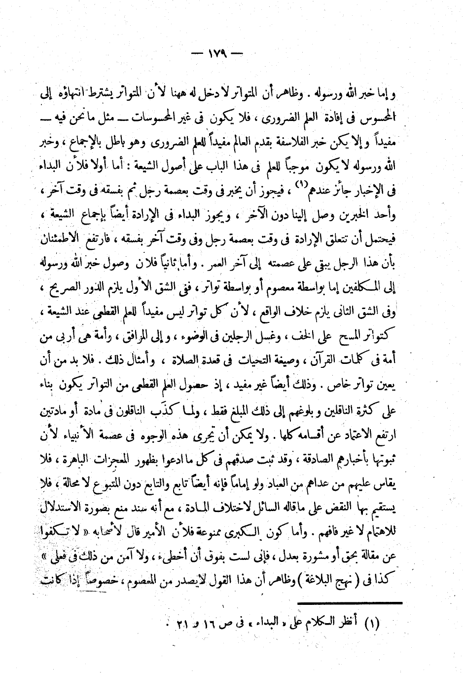 وإما خبر الله ورسوله. وظاهر أن المتواتر لا دخل له ههنا لأن المتواتر يشترط انتهاؤه إلى المحسوس في إفادة العلم الضروري، (¬1) فلا يكون في غير المحسوسات - مثل ما نحن فيه - مفيدا وإلا يكن خبر الفلاسفة بقدم العالم مفيدا للعلم الضروري وهو باطل بالإجماع، وخبر الله ورسوله لا يكون موجبا للعلم في هذا الباب على أصول الشيعة: أما أولا فلأن البداء في الإخبار جائز عندهم، فيجوز أن يخبر في وقت بعصمة رجل ثم بفسقه في وقت آخر، وأحد الخبرين وصل إلينا دون الآخر، وبجوز البداء في الإرادة أيضا بإجماع الشيعة (¬2) فيحتمل أن تتعلق الإرادة في وقت بعصمة رجل وفي وقت آخر بفسقه، فارتفع الاطمئنان بأن هذا الرجل يبقى على عصمته إلى آخر العمر. وأما ثانيا: فلأن وصول خبر الله ورسوله إلى المكلفين إما بواسطة معصوم أو بواسطة تواتر، ففي الشق الأول يلزم الدور الصريح، وفي الشق الثاني يلزم خلاف الواقع، لأن كل تواتر ليس مفيدا للعلم القطعي عند الشيعة، (¬3) كتواتر المسح على الخف، وغسل الرجلين في الوضوء، وإلى المرافق، وأمة هي أربى من أمة في كلمات القرآن، (¬4)