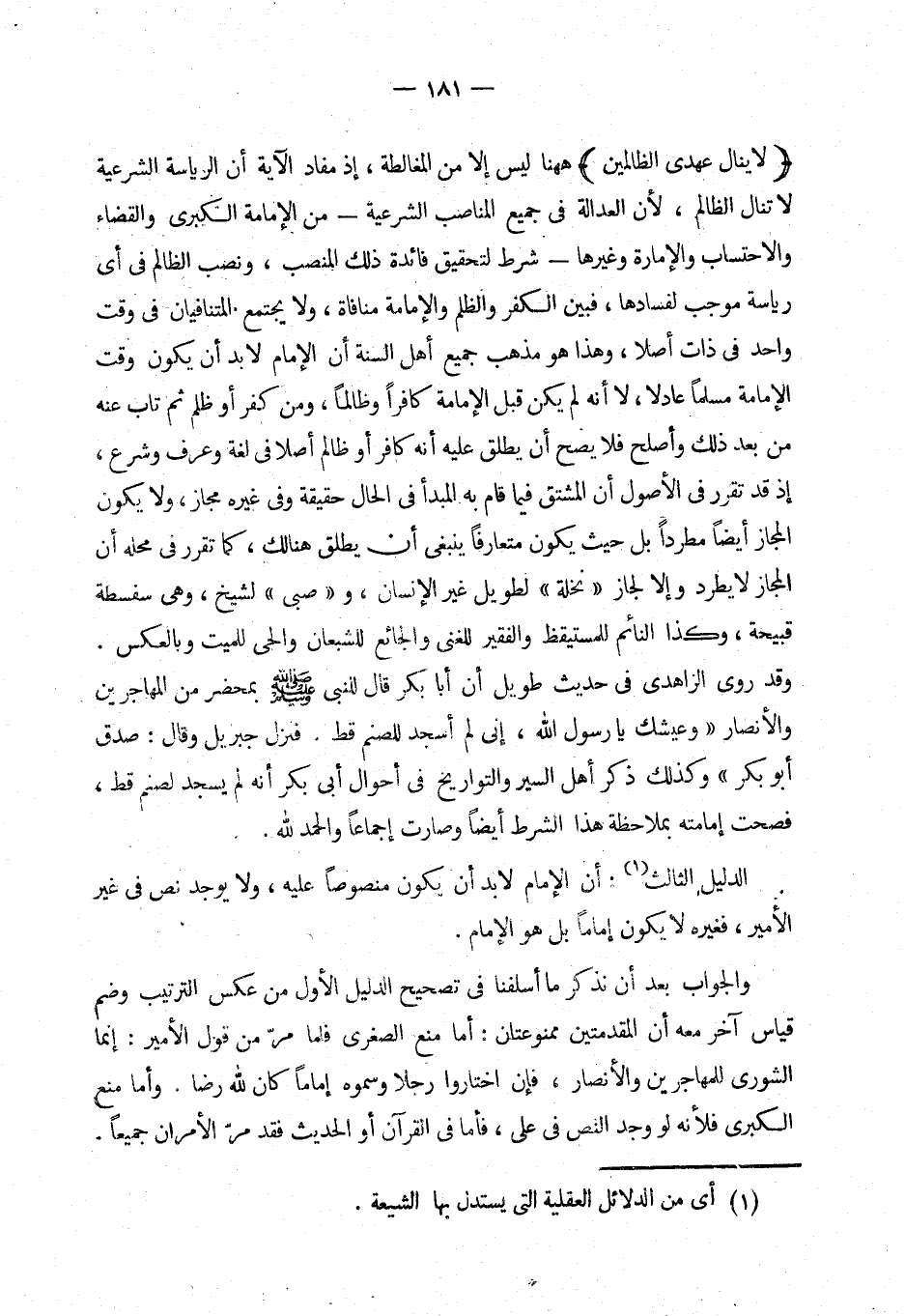 {لا ينال عهدي الظالمين} ههنا ليس إلا من المغالطة، إذ مفاد الاية أن الرياسة الشرعية لا تنال الظالم، (¬1) لأن العدالة في جميع المناصب الشرعية - من الإمامة الكبرى والقضاء والاحتساب والإمارة وغيرها - شرط لتحقيق فائدة ذلك المنصب، ونصب الظالم في أي رياسة موجب لفسادها، فبين الكفر والظلم والإمامة منافاة، ولا يجتمع التنافيان في وقت واحد في ذات أصلا، وهذا هو مذهب جميع أهل السنة أن الإمام لا بد أن يكون وقت الإمامة مسلما عادلا، لا أنه لم يكن قبل الإمامة كافرا وظالما، ومن كفر أو ظلم ثم تاب عنه من بعد ذلك وأصلح فلا يصح أن يطلق عليه أنه كافر أو ظالم أصلا في لغة وعرف وشرع، إذ قد تقرر في الأصول أن المشتق فيما قام به المبدأ في الحال حقيقة وفي غيره مجاز، ولا تكون المجاز أيضا مطرودا بل حيث يكون متعارفا ينبغي أن يطلق هنالك، كما تقرر في محله أن المجاز لا يطرد وإلا لجاز «نخلة» لطويل غير الإنسان، و «صبي» لشيخ، وهي سفسطة قبيحة، (¬2) كذا النائم للمستيقظ والفقير للغني والجائع للشبعان والحي للميت وبالعكس. وقد روى الزاهدي في حديث طويل أن أبا بكر قال للنبي - صلى الله عليه وسلم - بمحضر من المهاجرين والأنصار «وعيشك يا رسول الله، إني لم أسجد للصنم قط، فنزل جبريل وقال: صدق أبو بكر» وكذلك ذكر أهل السير والتواريخ في أحوال أبي بكر أنه لم يسجد لصنم قط، فصحت إمامته بملاحظة هذا الشرط أيضا وصارت إجماعا والحمد لله.