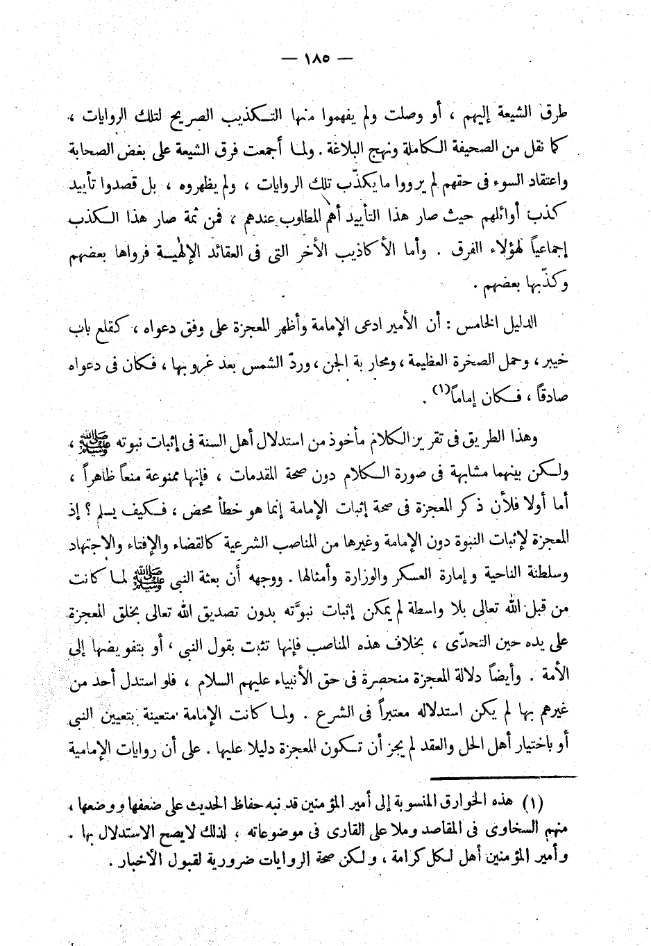 (¬3) هذه الخوارق المنسوبة إلى أمير المؤمنين قد نبه حفاظ الحديث على ضعفها ووضعها منهم السخاوي في المقاصد وملا علي القاري في موضوعاته لذلك لا يصح الاستدلال بها. وأمير المؤمنين أهل لكل كرامة ولكن صحة الروايات ضرورية لقبول الأخبار.