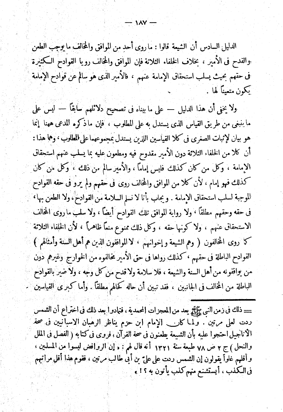ولا يخفى أن هذا الدليل - على ما بيناه في تصحيح دلائلهم سابقا - ليس على ما ينبغي من طريق القياس الذي يستدل به على المطلوب، فإن ما ذكره المدعي ههنا إنما هو بيان لإثبات الصغرى في كلا القياسين اللذين يستدل بمجموعهما على المطلوب، وهما هذا: أن كلا من الخلفاء الثلاثة دون الأمير مقدوح فيه ومطعون عليه بما يسلب عنهم استحقاق الإمامة، وكل من كان كذلك فليس إماما، والأمير سالم من ذلك، وكل من كان كذلك فهو إمام، لأن كلا من الموافق والمخالف روى في حقهم ولم يروا في حقه القوادح الموجبة لسلب استحقاق الإمامة.