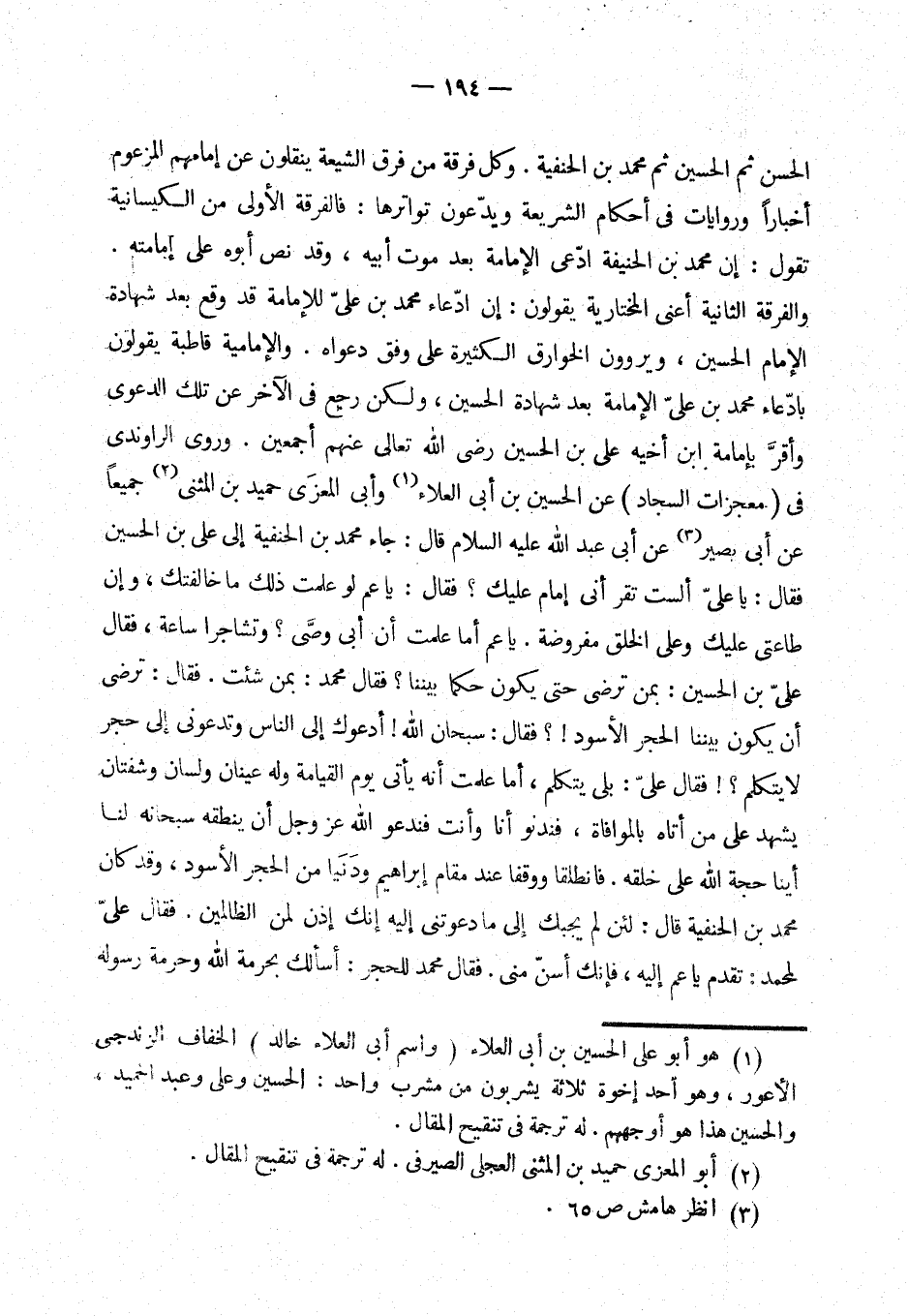 الحسن ثم الحسين ثم محمد بن الحنفية. (¬1) وكل فرقة من فرق الشيعة ينقلون عن إمامهم المزعوم أخبارا وروايات في أحكام الشريعة ويدعون تواترها: فالفرقة الأولى من الكيسانية تقول: إن محمد بن الحنيفة ادعى الإمامة بعد موت أبيه وقد نص أبوه على إمامته. والفرقة الثانية أعني المختارية يقولون: إن ادعاء محمد بن علي (¬2) للإمامة قد وقع بعد شهادة الإمام الحسين، ولكن رجع في الآخر عن تلك الدعوى وأقر بإمامة ابن أخيه علي بن الحسين - رضي الله تعالى عنهم - أجمعين. وروى الراوندي في (معجزات السجاد) (¬3) عن الحسين بن أبي العلاء وأبي المعزي حميد بن المثنى جميعا عن أبي بصير عن أبي عبد الله - عليه السلام - قال: جاء محمد بن الحنفية إلى علي بن الحسين فقال: يا علي ألست تقر أني إمام عليك؟ فقال: يا عم لو علمت ذلك ما خالفتك وإن طاعتي عليك وعلى الخلق مفروضة، يا عم أما علمت أن أبي وصى؟ وتشاجرا ساعة فقال علي بن الحسين: بمن ترضى حتى يكون حكما بيننا؟ فقال محمد: بمن شئت. فقال: ترضى أن يكون بيننا الحجر الأسود؟ فقال: سبحان الله! أدعوك إلى الناس وتدعوني إلى حجر لا يتكلم؟ فقال علي: بلى يتكلم، أما علمت أنه يأتي يوم القيامة وله عينان ولسان وشفتان يشهد على من أتاه بالموافاة، فندنو أنا وأنت فندعو الله عز وجل أن ينطقه سبحانه لنا أينا حجة الله على خلقه فانطلقا ووقفا عند مقام إبراهيم ودنيا من الحجر الأسود وقد كان محمد بن الحنفية قال: لئن لم يجبك إلى ما دعوتني إليه إنك إذن لمن الظالمين فقال علي لمحمد: تقدم يا عم إليه فإنك أسن مني.