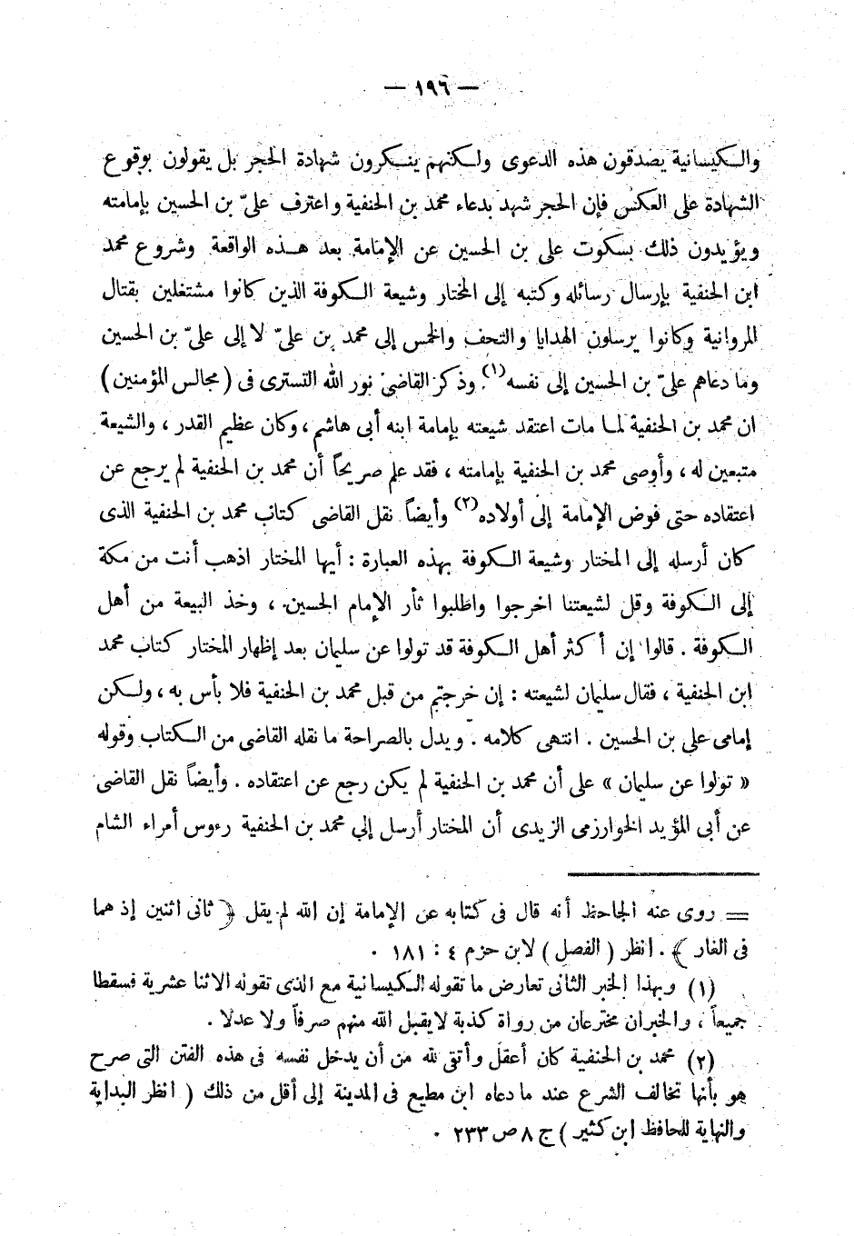 والكيسانية يصدقون هذه الدعوى ولكنهم ينكرون شهادة الحجر بل يقولون بوقوع الشهادة على العكس. فإن الحجر شهد بدعاء محمد بن الحنفية واعترف علي بن الحسين بإمامته ويؤيدون ذلك بسكوت علي بن الحسين عن الإمامة بعد هذه الواقعة وشروع محمد ابن الحنفية بإرسال رسائله وكتبه إلى المختار وشيعة الكوفة الذين كانوا مشتغلين بقتال المروانية وكانوا يرسلون الهدايا والتحف والخمس إلى محمد بن علي لا إلى علي بن الحسين وما دعاهم علي بن الحسين إلى نفسه (¬1) وذكر القاضي نور الله التستري في (مجالس المؤمنين) أن محمد بن الحنفية لما مات اعتقد شيعته بإمامة ابنه أبي هاشم، وكان عظيم القدر، والشيعة متبعين له وأوصى محمد بن الحنفية بإمامته، فقد علم صريحا أن محمد بن الحنفية لم يرجع عن اعتقاده حتى فوض الإمامة إلى أولاده (¬2) وأيضا نقل القاضي كتاب محمد بن الحنفية الذي كان أرسله إلى المختار وشيعته الكوفة بهذه العبارة: أيها المختار اذهب أنت من مكة إلى الكوفة وقل لشيعتنا اخرجوا واطلبوا ثأر الإمام الحسين، وخذ البيعة من أهل الكوفة. قالوا إن أكثر أهل الكوفة قد تولوا عن سليمان بعد إظهار المختار كتاب محمد ابن الحنفية، فقال سليمان لشيعته: إن خرجتم من قبل محمد بن الحنفية فلا بأس به، ولكن إمامي علي بن الحسين. (¬3) انتهى كلامه. ويدل بالصراحة ما نقله القاضي من الكتاب وقوله «تولوا عن سليمان» على أن محمد بن الحنفية لم يكن رجع عن اعتقاده. وأيضا نقل القاضي (¬4) عن أبي المؤيد الخوارزمي الزيدي أن المختار أرسل إلى محمد بن الحنفية رءوس أمراء الشام