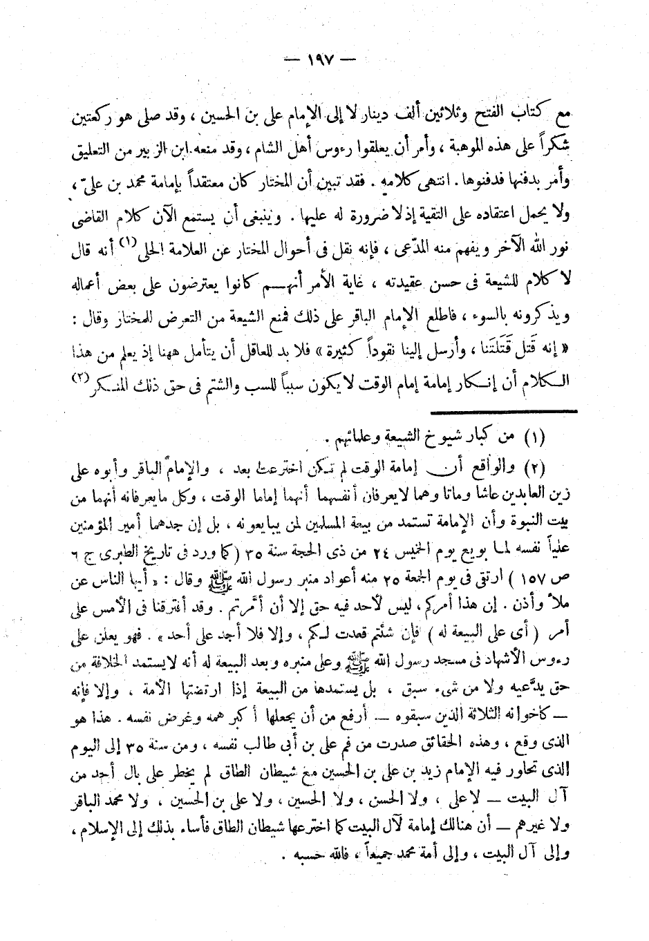 فقد تبين أن المختار كان معتقدا بإمامة محمد بن علي، ولا يحمل اعتقاده على التقية إذ لا ضرورة له عليها. وينبغي أن يستمع الآن كلام القاضي نور الله الآخر، ويفهم منه المدعى، فإنه نقل في أحوال المختار عن العلامة الحلي انه قال لا كلام للشيعة في حسن عقيدته، (¬2) غاية الأمر أنهم كانوا يعترضون على بعض أعماله ويذكرونه بالسوء فاطلع الإمام الباقر على ذلك فمنع الشيعة من التعرض للمختار وقال: «إنه قتل قتلتنا، وأرسل نقودا كثيرة» (¬3) فلا بد للعاقل أن يتأمل ههنا إذ يعلم من هذا الكلام أن إنكار إمامة إمام الوقت (¬4) لا يكون سببا للسب والشتم في حق ذلك المنكر.