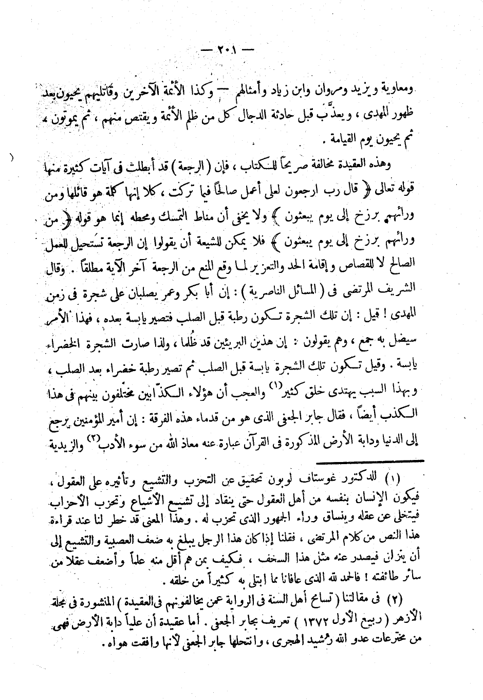 وهذه العقيدة مخالفة صريحا للكتاب، فإن الرجعة قد أبطلت في أيات كثيرة منها قوله تعالى {قال رب ارجعون لعلي أعمل صالحا فيما تركت، كلا إنها كلمة هو قائلها ومن ورائهم برزخ إلى يوم يبعثون} ولا يخفى أن مناط التمسك ومحطه إنما هو قوله {من ورائهم برزخ إلى يوم يبعثون} (¬1) فلا يمكن للشيعة أن يقولوا إن الرجعة تستحيل للعمل الصالح لا للقصاص وإقامة الحد والتعزير لما وقع المنع من الرجعة آخر الآية مطلقا. وقال الشريف المرتضى في (المسائل الناصرية): (¬2) إن أبا بكر وعمر يصلبان على شجرة في زمن المهدي، قيل: إن تلك الشجرة تكون رطبة قبل الصلب فتصير يابسة بعده، فهذا الأمر سيضل به جمع، وهم يقولون: إن هذين البريئين قد ظلما، ولذا صارت الشجرة الخضراء يابسة. وقيل تكون تلك الشجرة يابسة قبل الصلب ثم تصير رطبة خضراء بعد الصلب، وبهذا السبب يهتدي خلق كثير. (¬3)