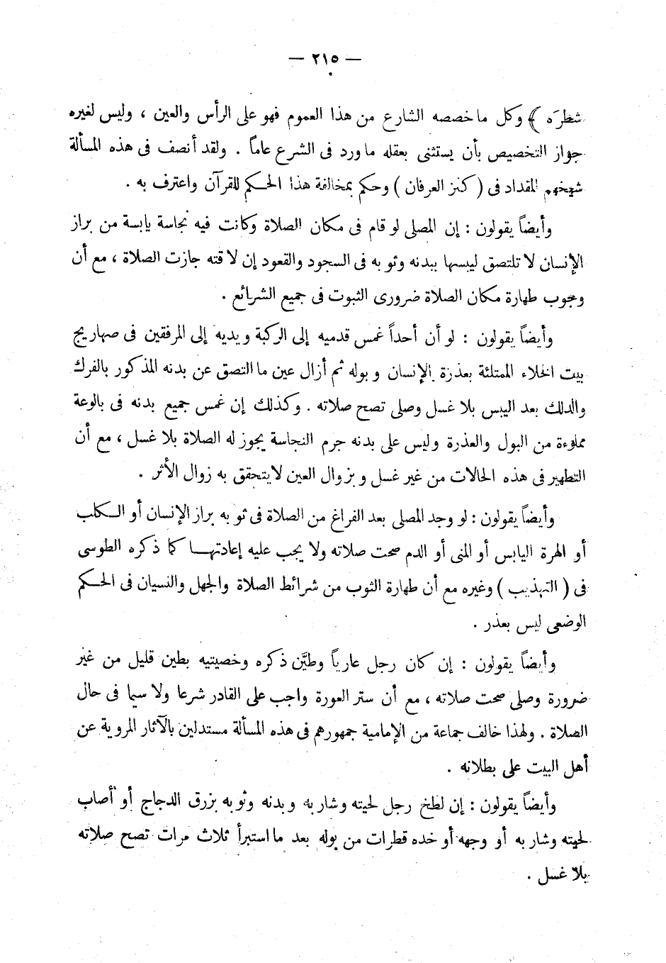 وأيضا يقولون: إن كان رجلا عاريا وطين ذكره وخصيتيه بطين قليل من غير ضرورة وصلى صحت صلاته، (¬5) مع أن ستر العورة واجب على القادر شرعا ولا سيما في حال الصلاة. ولهذا خالف جماعة من الإمامية جمهورهم في هذه المسألة مستدلين بالآثار المروية عن أهل البيت على بطلانه. (¬6)