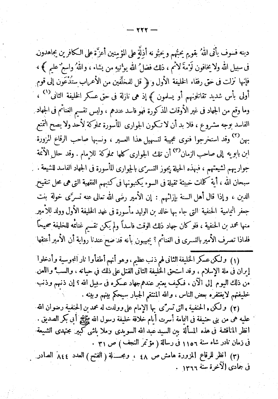 دينه فسوف يأتي الله بقوم يحبهم ويحبونه أذلة على المؤمنين أعزة على الكافرين يجاهدون في سبيل الله ولا يخافون لومة لائم ذلك فضل الله يؤتيه من يشاء والله واسع عليم}، فإنها نزلت في حق رفقاء الخليفة الأول، (¬1) و {قل للمخلفين من الأعراب ستدعو ن إلى قوم أولي بأس شديد تقاتلونهم أو يسلمون} إذ هي نازلة في حق عساكر الخليفة الثاني، (¬2) وما وقع من الجهاد في غير الأوقات المذكورة فهو فاسد عندهم، وليس تقسيم الغنائم في الجهاد الفاسد بوجه مشروع، فلا بد أن تكون الجواري المأسورة مملوكة لأحد ولا يصح التمتع بهن. (¬3) وقد استخرجوا فتوى عجيبة لتسهيل هذا العسير، ونسبها صاحب الرقاع المزورة (¬4) ابن بابويه إلى صاحب الزمان أن تلك الجواري كلها مملوكة للإمام. (¬5) وقد حلل الأئمة جواريهم لشيعتهم، فبهذه الحيلة يجوز التسرى بالجوارى المأسورة في الجهاد الفاسد للشيعة.