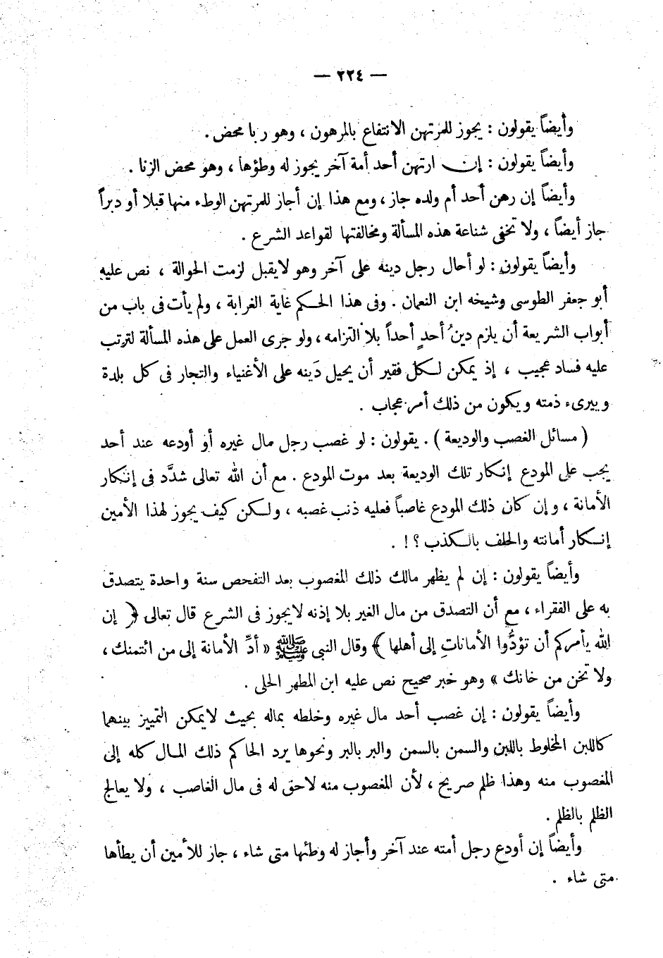 وأيضا يقولون: إن لم يظهر مالك ذلك المغصوب بعد التفحص سنة واحدة يتصدق به على الفقراء، مع أن التصدق من مال الغير بلا إذنه لا يجوز في الشرع. قال تعالى {إن الله يأمركم أن تؤدوا الأمانات إلى أهلها} وقال النبي - صلى الله عليه وسلم - «أد الأمانة إلى من ائتمنك ولا تخن من خانك» (¬4) وهو خبر صحيح نص عليه ابن المطهر الحلي. (¬5)