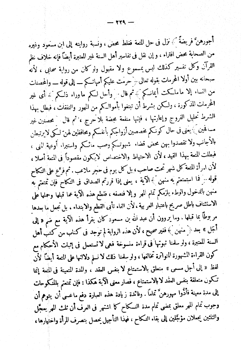 وما يروون أن عبد الله بن مسعود كان يقرأ هذه الآية مع ضم «إلى أجل» بعد {منهن} فغير صحيح لأن هذه الرواية لم توجد في كتاب من كتب أهل السنة المعتبرة، (¬5) ولو سلمنا ثبوتها في قراءة منسوخة فهي لا تستعمل في إثبات الأحكام مع كون القراءة المشهورة المتواترة تخالفها. (¬6) ولو سلمنا ذلك لا نسلم دلالتها على المتعة أيضا لأن لفظ {إلى أجل مسمى} متعلق بالاستمتاع لا بنفس العقد، والمدة المتعينة في المتعة إنما تكون متعلقة بنفس العقد لا بالاستمتاع، فصار معنى الآية هكذا: فإن تمتعتم بالمنكوحات إلى مدة معينة فأدوا مهورهن تماما. وفائدة زيادة هذه العبارة دفع ما عسى أن يتوهم أن وجوب تمام المهر معلق بمضي تمام مدة النكاح كما اشتهر في العرف أن ثلث المهر يعجل والثلثين يجعلان مؤجلين إلى بقاء النكاح، فهذا التأجيل يحصل بتصرف المرأة واختيارها،