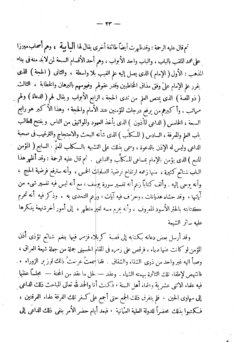 ثم قال عليه الرحمة: وقد ظهرت أيضا طائفة أخرى يقال لها البابية، (¬1) وهم أصحاب ميرزا علي محمد الملقب بالباب، والباب واحد الأبواب، وهم أحد الأقسام السبعة لمن لا بد منه في بناء المذهب: الأول (الإمام) الذي يصل إليه علم الغيب بلا واسطة، والثاني (الحجة) الذي يقرر علم الإمام على وفق مذاق المخاطبين وقدر عقولهم وفهومهم بالبرهان والخطابة، الثالث (ذو المصة) الذي يمتص العلم من ثدي الحجة، الرابع الأبواب ويقال لهم الدعاة ولهم مراتب، وأكبرهم من يرفع درجات المؤمنين عند الإمام والحجة، وهذا الأكبر هو رابع السبعة، الخامس (الداعي المأذون) الذي يأخذ العهود والمواثيق من الناس ويفتح للطالب باب العلم والمعرفة، السادس (المكلَّب) الذي شأنه البحث والاحتجاج والترغيب في صحبة الداعي وليس له الإذن بالدعوة، وسمي بذلك على التشبيه بالكلب المعلََّم. السابع (المؤمن المتبع) الذي يؤمن بالإمام بمساعي المكلَّب والداعي.