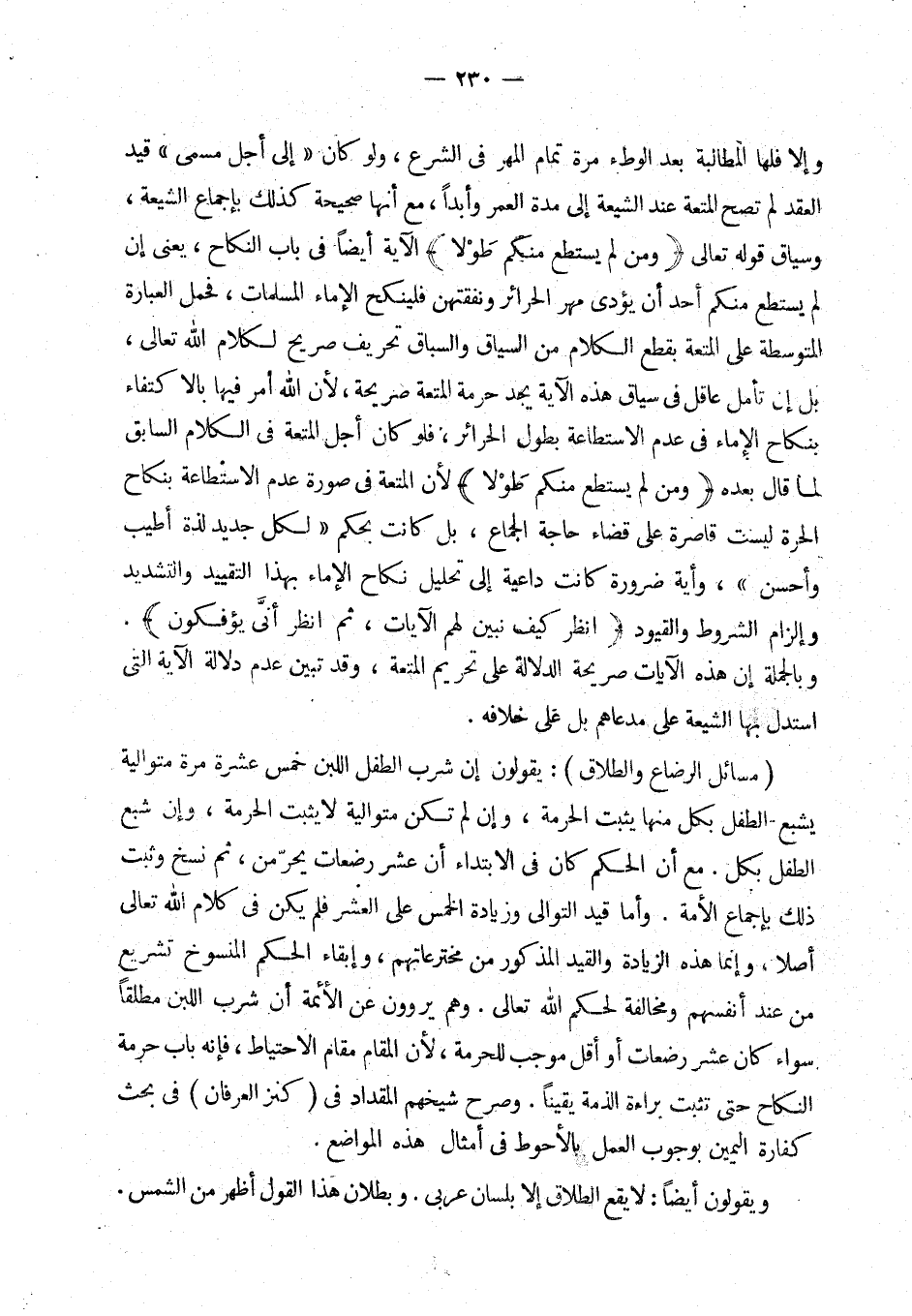 بل إن تأمل عاقل في سياق هذه الآية يجد حرمة المتعة صريحة، لأن الله أمر فيها بالاكتفاء بنكاح الإماء في عدم الاستطاعة بطول الحرائر، فلو كان أحل المتعة في الكلام السابق لما قال بعده {ومن لم يستطع منكم طولا} لأن المتعة في صورة عدم الاستطاعة بنكاح الحرة ليست قاصرة على قضاء حاجة الجماع، بل كانت بحكم «لكل جديد لذة أطيب وأحسن». وأية ضرورة كانت داعية إلى تحليل نكاح الإماء بهذا التقييد والتشديد وإلزام الشروط والقيود {انظر كيف نبين لهم الآيات ثم انظر أنى يؤفكون}. وبالجملة إن هذه الآيات صريحة الدلالة على تحريم المتعة، وقد تبين عدم دلالة الآية التي استدل بها الشيعة على مدعاهم بل على خلافه.