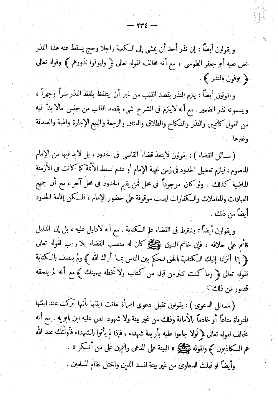 يقولون لا ينفذ قضاء القاضي في الحدود، بل لابد فيها من الإمام المعصوم. (¬3) فيلزم تعطيل الحدود في زمن غيبة الإمام أو عدم تسلط الائمة كما كانت في الأزمنة الماضية كذلك. ولو كان موجودا في محل فمن يقيم الحدود في محل آخر؟ مع أن جميع العبادات والمعاملات والكفارات ليست موقوفة على حضور الإمام، فلتكن إقامة الحدود أيضا من ذلك.