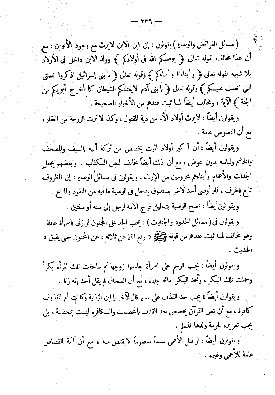 ويقولون أيضا: إن أكبر أولاد الميت (¬5) يخصص من تركة أبيه بالسيف والمصحف والخاتم ولباسه بدون عوض، (¬6) مع أن ذلك أيضا مخالف لنص الكتاب. وبعضهم يجعل الجدات والأعمام وأبناءهم محرومين من الأرث. (¬7)
