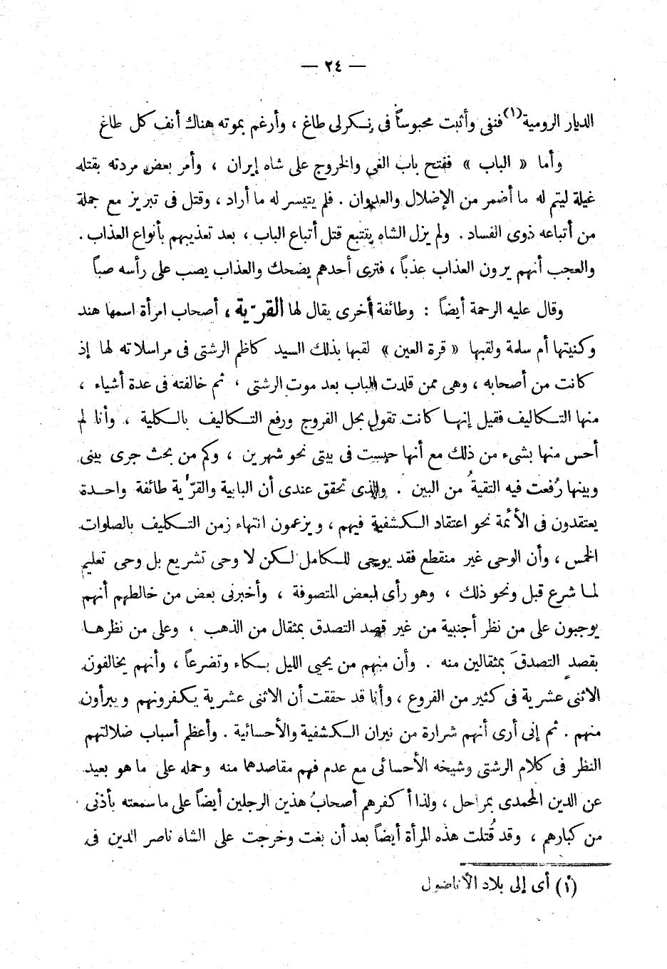 وقال عليه الرحمة أيضا: وطائفة أخرى يقال لها القرتية: أصحاب امرأة اسمها هند، وكنيتها أم سلمة، ولقبها قرة العين، لقبها بذلك السيد كاظم الرشتي في مراسلاته لها إذ كانت من أصحابه، وهي ممن قلدت الباب بعد موت الرشتي، ثم خالفته في عدة أشياء منها التكاليف، فقيل أنها كانت تقول بحل الفروج ورفع التكاليف بالكلية، وأنا لم أحس منها بشيء من ذلك مع أنها حبست في بيتي نحو شهرين، وكم بحث جرى بيني وبينها رفعت فيه التقية من البين.