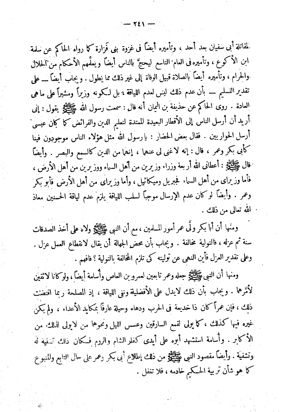لمقاتلة أبي سفيان بعد أحد، وتأميره أيضا في غزوة بني فزارة كما رواه الحاكم عن سلمة بن الأكوع، وتأميره في العام التاسع ليحج بالناس أيضا ويعلمهم الأحكام من الحلال والحرام، (¬1) وتأميره أيضا بالصلاة قبيل الوفاة، (¬2) إلى غير ذلك من مما يطول.