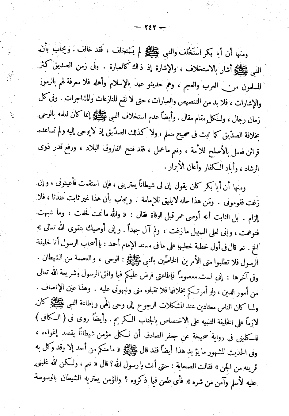 ويجاب بأن هذا غير ثابت عندنا، فلا إلزام. بل الثابت أنه أوصى عمر قبل الوفاة فقال: «والله ما نمت فحلمت، وما شبهت فتوهمت، وإني لعلى السبيل ما زغت، ولم آل جهدا. وإني أوصيك بتقوى الله تعالى» (¬6) الخ. نعم قال في أول خطبة خطبها على ما في مسند الإمام أحمد: «يا أصحاب الرسول أنا خليفة الرسول فلا تطلبوا مني الأمرين الخاصين بالنبي - صلى الله عليه وسلم -: الوحي والعصمة من الشيطان» ... وفي آخرها: «إني لست معصوما فإطاعتي فرض عليكم فيما وافق الرسول وشريعة الله تعالى من أمور الدين، ولو أمرتكم بخلافها فلا تقبلوه مني ونبهوني عليه». وهذا عين الإنصاف. ولما كان الناس معتادين عند المشكلات الرجوع إلى وحي إلهي وإطاعة النبي - صلى الله عليه وسلم - كان لازما على الخليفة التنبيه على الاختصاص بالجناب الكريم. وأيضا روي في الكافي للكليني في رواية صحيحة عن جعفر الصادق أن لكل مؤمن شيطانا يقصد إغواءه. (¬7) وفي الحديث المشهور ما يؤيد هذا أيضا فقد قال - صلى الله عليه وسلم - «ما منكم من أحد إلا وقد وكل به قرينه من الجن» فقالت الصحابة: حتى أنت يا رسول الله؟ قال «نعم، ولكن الله غلبني عليه لأسلم وآمن من شره». (¬8) فأي طعن فيما ذكروه؟ والمؤمن يعتريه الشيطان بالوسوسة