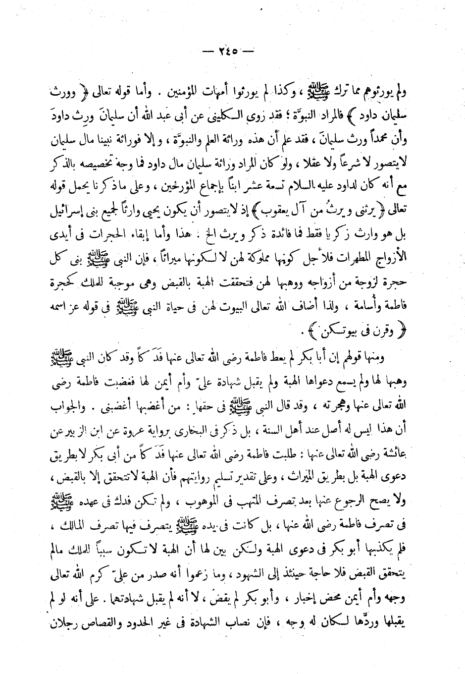 وأما قوله تعالى {ورث سليمان داود} (¬2) فالمراد النبوة. فقد روى الكليني عن أبي عبد الله «أن سليمان ورث داود وأن محمدا ورث سليمان»، (¬3) فقد علم أن هذه وراثة العلم والنبوة، وإلا فوراثة نبينا مال سليمان لا يتصور لا شرعا ولا عقلا، ولو كان المراد وراثة سليمان مال داود فما وجه تخصيصه بالذكر مع أنه كان لداود - عليه السلام - تسعة عشر ابنا (¬4) بإجماع المؤرخين، وعلى ما ذكرنا يحمل قوله تعالى {يرثني ويرث من آل يعقوب} إذ لا يتصور أن يكون يحيى وراثا لجميع بني إسرائيل بل هو وارث زكريا فقط فما فائدة ذكر {ويرث} الخ. (¬5)