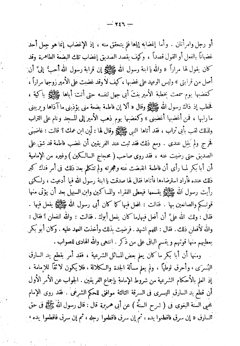 أو رجل وامرأتان. وأما إغضابه إياها فلم يتحقق منه، إذ الإغضاب إنما هو جعل أحد غضبانا بالفعل أو القول قصدا، وكيف يقصد الصديق إغضاب تلك البضعة الطاهرة وقد كان يقول لها مرارا «والله با ابنة رسول الله إن قرابة رسول الله أحب إلي أن أصل من قرابتي» وليس الوعيد على غضبها، كيف لا وقد غضبت على الأمير زوجها مرارا كغضبها يوم سمعت بخطبة الأمير بنت أبي جهل لنفسه حتى أتت أباها - صلى الله عليه وسلم - باكية فخطب إذ ذاك رسول الله - صلى الله عليه وسلم - وقال «ألا إن فاطمة بضعة مني يؤذيني ما آذاها ويربيني ما رأبها، فمن أغضبها أغضبني». (¬1) وكغضبها يوم ذهب الأمير إلى المسجد ونام على التراب ولذلك لقب بأبي تراب، فقد أتاها النبي - صلى الله عليه وسلم - وقال لها: أين ابن عمك؟ قالت: غاضبني فخرج ولم يقل عندي. (¬2)