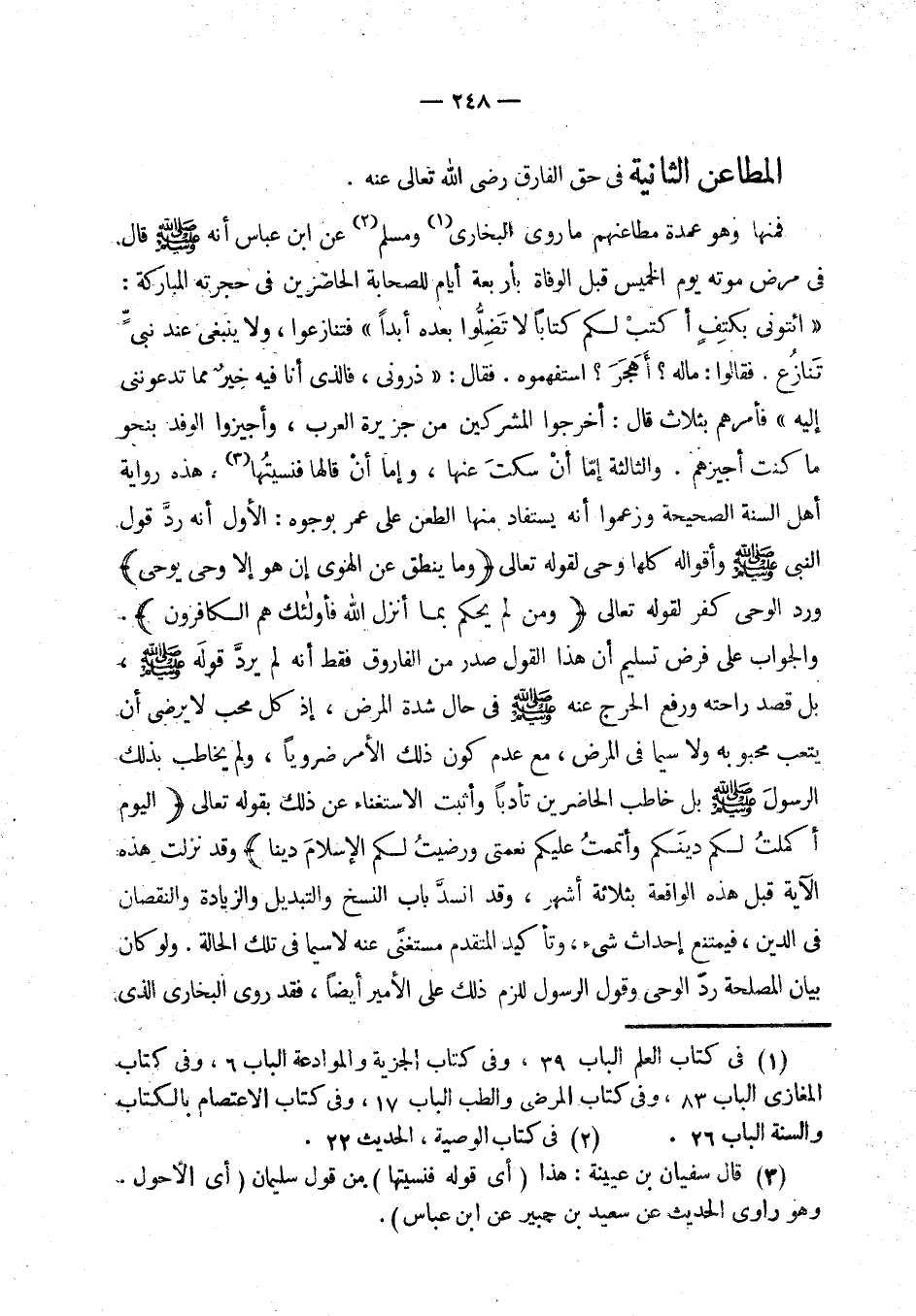 فمنها وهو عمدة مطاعنهم ما روى البخاري ومسلم عن ابن عباس أنه - صلى الله عليه وسلم - قال في مرض موته يوم الخميس قبل الوفاة بأربعة أيام للصحابة الحاضرين في حجرته المباركة: «ائتوني بكتف أكتب لكم كتابا لا تضلوا بعده أبدا» فتنازعوا، ولا ينبغي عند نبي تنازع. فقالوا: ما له أهجر؟ استفهموه. فقال: «ذروني، فالذي أنا فيه خير مما تدعونني إليه» فأمرهم بثلاث قال: «أخرجوا المشركين من جزيرة العرب، وأجيزوا الوفد بنحو ما كنت أجيزهم». والثالثة إما أن سكت عنها، وإما أن قالها فنسيتها. (¬1)