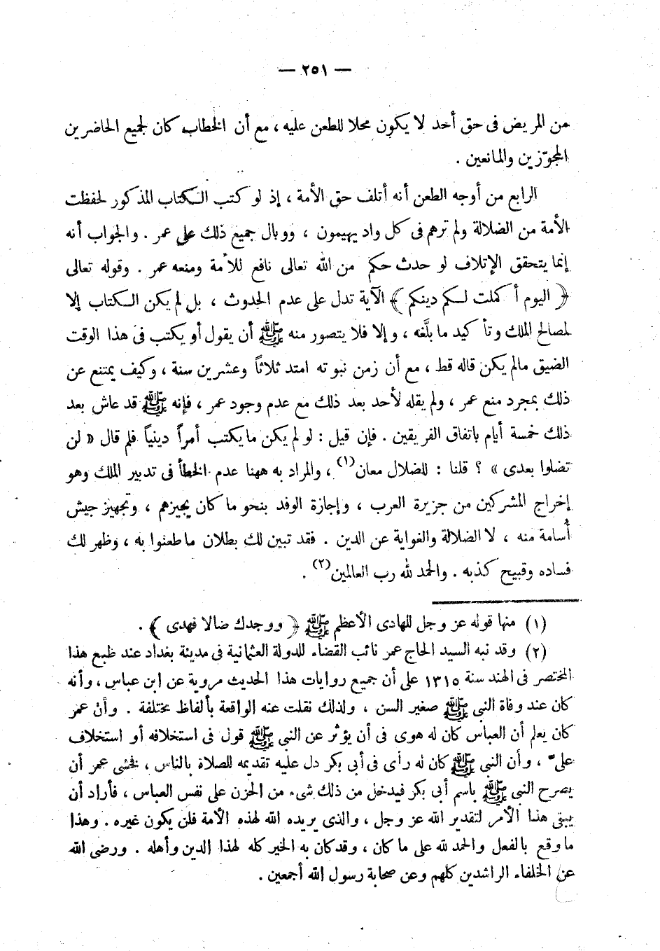 فإن قيل: لو لم يكن ما يكتب أمرا دينيا فلم قال «لن تضلوا بعدي»؟ قلنا: للضلال معان، والمراد ههنا عدم الخطأ في تدبير الملك وهو إخراج المشركين من جزيرة العرب، وإجازة الوفد بنحو ما كان يجيزهم، وتجهيز جيش أسامة منه، لا الضلالة والغواية عن الدين. فقد تبين لك بطلان ما طعنوا به، وأظهر لك فساده وقبيح كذبه. والحمد لله رب العالمين. (¬3)