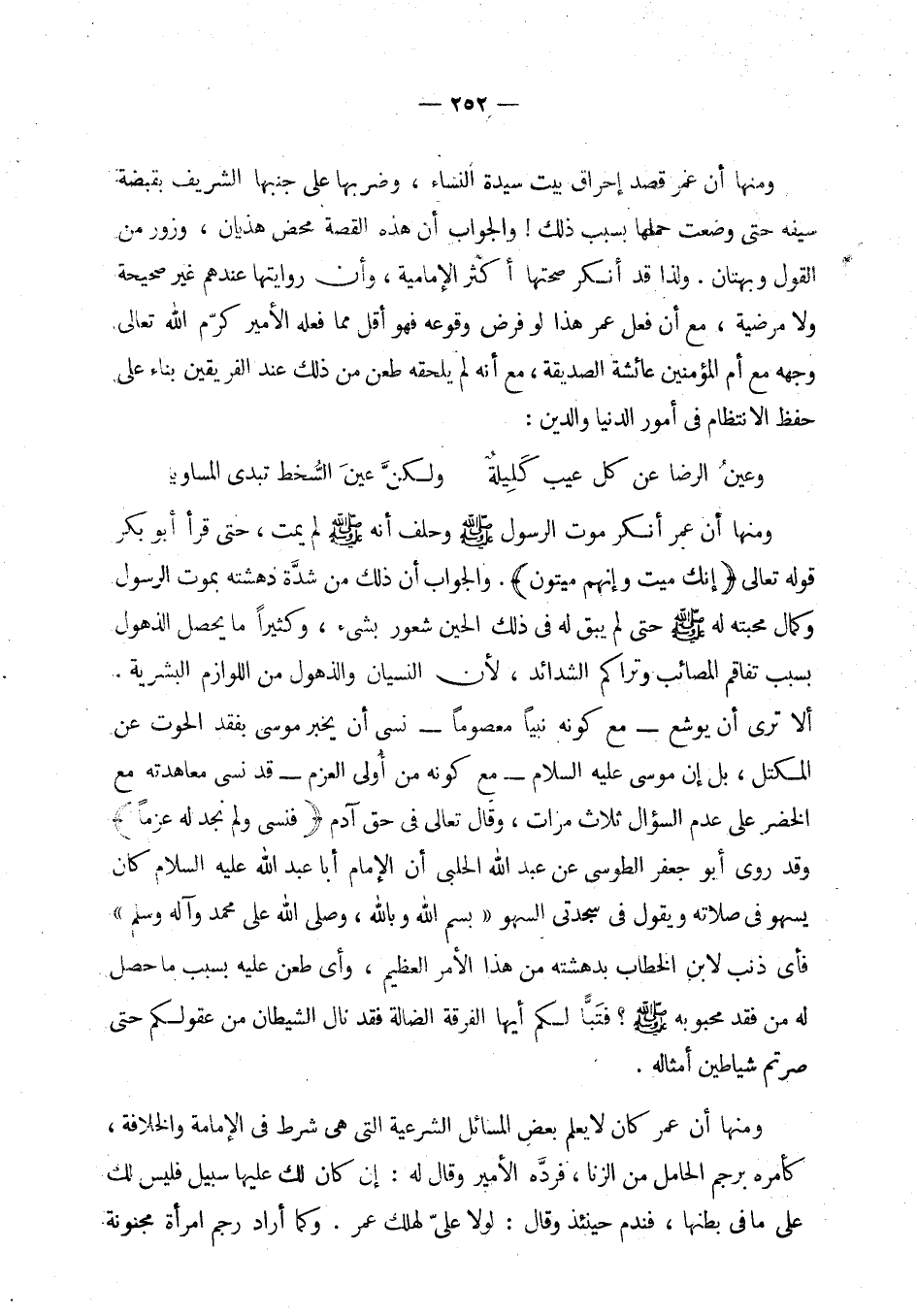 والجواب أن هذه القصة محض هذيان وزور من القول وبهتان. ولذا قد أنكر صحتها أكثر الإمامية وأن روايتها عندهم غير صحيحة ولا مرضية. (¬2) مع أن فعل عمر هذا لو فرض وقوعه فهو أقل مما فعله الأمير كرم الله تعالى وجهه مع أم المؤمنين عائشة الصديقة، مع أنه لم يلحقه طعن من ذلك عند الفريقين بناء على حفظ الانتظام في أمور الدنيا والدين:
