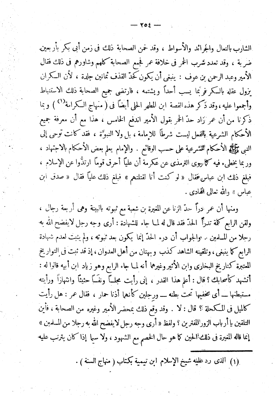 الشارب بالنعال والجرائد والأسواط، وقد خمن الصحابة ذلك من زمن أبي بكر بأربعين ضربة، (¬1) وقد تعدد شرب الخمر في خلافة عمر فجمع الصحابة كلهم وشاورهم في ذلك فقال الأمير وعبد الرحمن بن عوف ينبغي أن يكون كحد القذف ثمانين جلدة، لأن السكران يزول عقله بالسكر فربما يسب أحدا ويشتمه، فارتضى جميع الصحابة ذلك الاستنباط وأجمعوا عليه، وقد ذكر هذه القصة ابن المطهر الحلي أيضا في (منهاج الكرامة) (¬2) وبما ذكرنا من أن عمر زاد حد الخمر بقول الأمير اندفع الخامس.