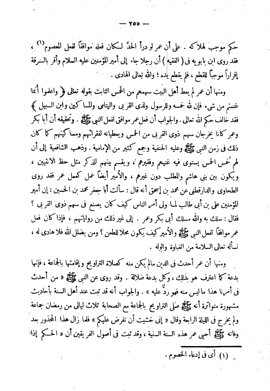 والجواب أن فعل عمر موافق لفعل النبي - صلى الله عليه وسلم -. وتحقيقه أن أبا بكر وعمر كانا يخرجان سهم ذوي القربى من الخمس ويعطيانه لفقرائهم ومساكينهم (¬4) كما كان ذلك في زمن النبي - صلى الله عليه وسلم -. وعليه الحنفية (¬5) وجمع كثير من الإمامية. (¬6) وذهب الشافعية إلى أن لهم خمس الخمس يستوى فيه غنيهم وفقيرهم، ويقسم بينهم للذكر مثل حظ الأنثيين، ويكون بين بني هاشم والمطلب دون غيرهم. (¬7) والأمير أيضا عمل كعمل عمر فقد روى الطحاوي والدارقطني عن محمد بن إسحق أنه قال: سألت أبا جعفر محمد [بن علي] بن الحسين [بن علي بن أبي طالب] (¬8): إن أمير المؤمنين على بن أبي طالب لما ولى أمر الناس كيف كان يصنع في سهم ذوي القربى؟ فقال: سلك به والله مسلك أبي بكر وعمر. (¬9) إلى غير ذلك من رواياتهم، فإذا كان فعل عمر موافقا لفعل النبي - صلى الله عليه وسلم - والأمير كيف يكون محلا للطعن؟ ومن يضلل الله فلا هادي له، نسأله تعالى السلامة من الغباوة والوله.