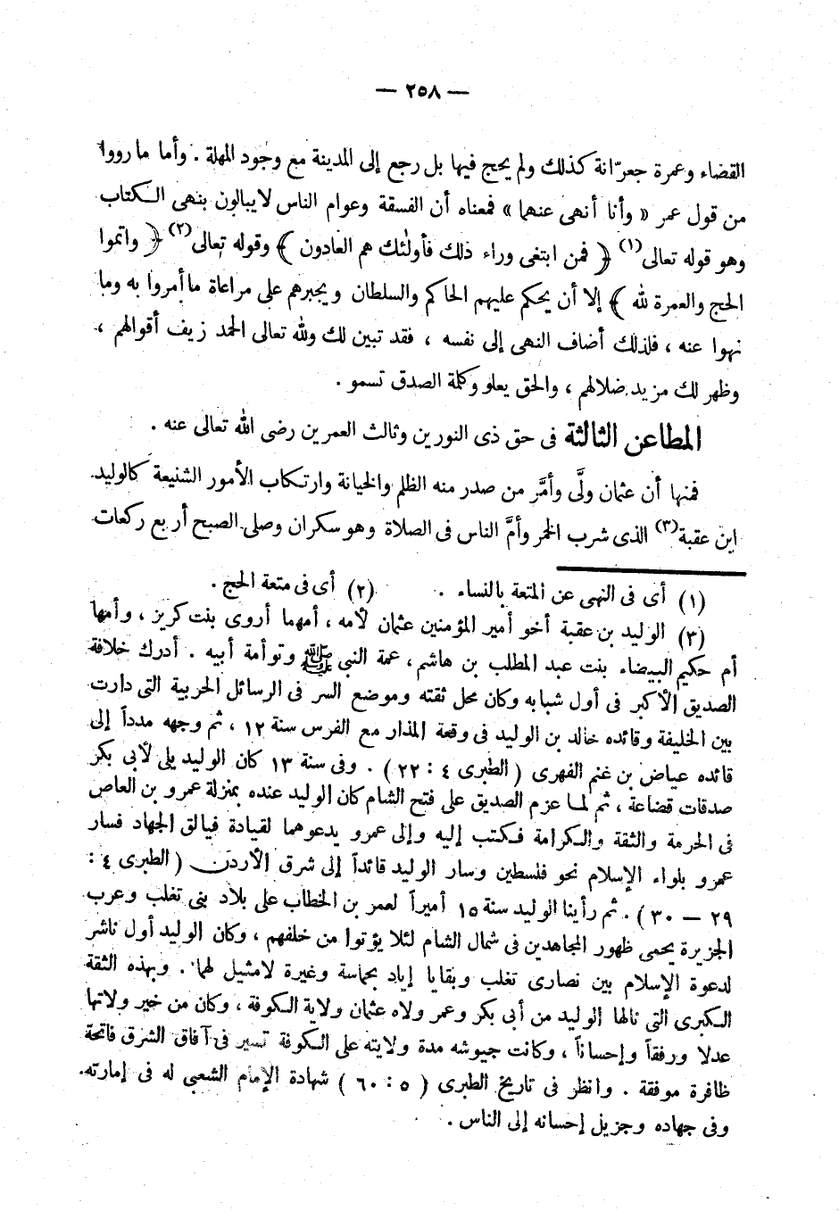 (¬3) الوليد بن عقبة أخو أمير المؤمنين عثمان لأمه، أمهما أروى بنت كريز، وأمها أم حكيم البيضاء بنت عبد المطلب بن هاشم، عمة النبي - صلى الله عليه وسلم - وتوأمة أبيه. أدرك خلافة الصديق الأكبر في أول شبابه وكان محل ثقته، وموضع السر في الرسائل الحربية التي دارت بين الخليفة وقائده خالد بن الوليد في وقعة المذار مع الفرس سنة 12. ثم وجهه مددا إلى قائده عياض بن غنم الفهري (الطبري 4: 22). وفي سنة 13 كان الوليد بلي لأبي بكر صدقات قضاعة، ثم لما عزم الصديق على فتح الشام كان الوليد عنده بمنزلة عمرو بن العاص في الحرمة والثقة والكرامة فكتب إليه وإلى عمرو يدعوهما لقيادة فيالق الجهاد فسار عمرو بلواء الإسلام نحو فلسطين وسار الوليد إلى شرق الأردن (الطبري 4: 29 - 30). ثم رأينا الوليد سنة 15 أميرا لعمر بن الخطاب على بلاد بني تغلب وعرب الجزيرة يحمى ظهور المجاهدين في شمال الشام لئلا يؤتوا من خلفهم. وكان الوليد أول ناشر لدعوة الإسلام بين نصارى تغلب وبقايا إياد بحماسة وغيرة لا مثيل لها. وبهذه الثقة الكبرى التي نالها الوليد من أبي بكر وعمر ولاه عثمان ولاية الكوفة، وكان من خير ولاتها عدلا ورفقا وإحسانا، وكانت جيوشه مدة ولايته على الكوفة تسير في آفاق الشرق فاتحة ظافرة موفقة. وانظر في تاريخ الطبري (5: 60) شهادة الإمام الشعبي له في إمارته وفي جهاده وجزيل إحسانه إلى الناس. وقد عزله عثمان - رضي الله عنه - بعد أن حده في شرب الخمر سنة 29هـ، ويقال إن بعض أهل الكوفة تعصبوا عليه فشهدوا عليه بغير الحق، ولما قتل عثمان اعتزل الوليد الفتنة، وكان قد غزا في سنة ثمان وعشرين أذربيجان وهو أمير القوم، مات في خلافة معاوية. الاستيعاب: 4/ 1552؛ الإصابة: 6/ 614.