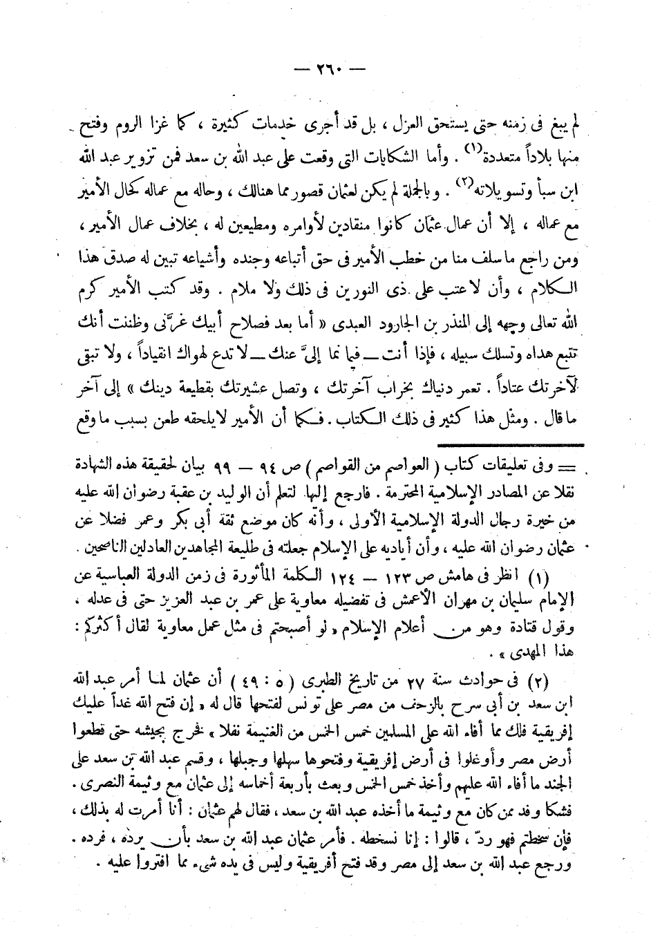 وأما الشكايات التي وقعت على عبد الله بن سعد فمن تزوير عبد الله ابن سبأ وتسويلاته. وبالجملة لم يكن لعثمان قصور مما هنالك، وحاله مع عماله كحال الأمير مع عمله، إلا أن عمال عثمان كانوا منقادين لأوامره ومطيعين له بخلاف عمال الأمير. ومن راجع ما سلف منا من خطب الأمير في حق أتباعه وجنده وأشياعه تبين له صدق هذا الكلام، وأن لا عتب على ذى النورين في ذلك ولا ملام. وقد كتب الأمير كرم الله تعالى وجهه إلى المنذر بن الجارود العبدي «أما بعد فصلاح أبيك غرني وظننت أنك تتبع هداه وتسلك سبيله، فإذا أنت - فيما نما إلي عنك - لا تدع لهواك انقيادا، ولا تبقى لآخرتك عتادا. تغمر دنياك بخراب آخرتك، وتصل عشيرتك بقطيعة دينك» إلى آخر ما قال. (¬2) ومثل هذا كثير في ذلك الكتاب. فكما أن الأمير لا يلحقه طعن بسبب ما وقع