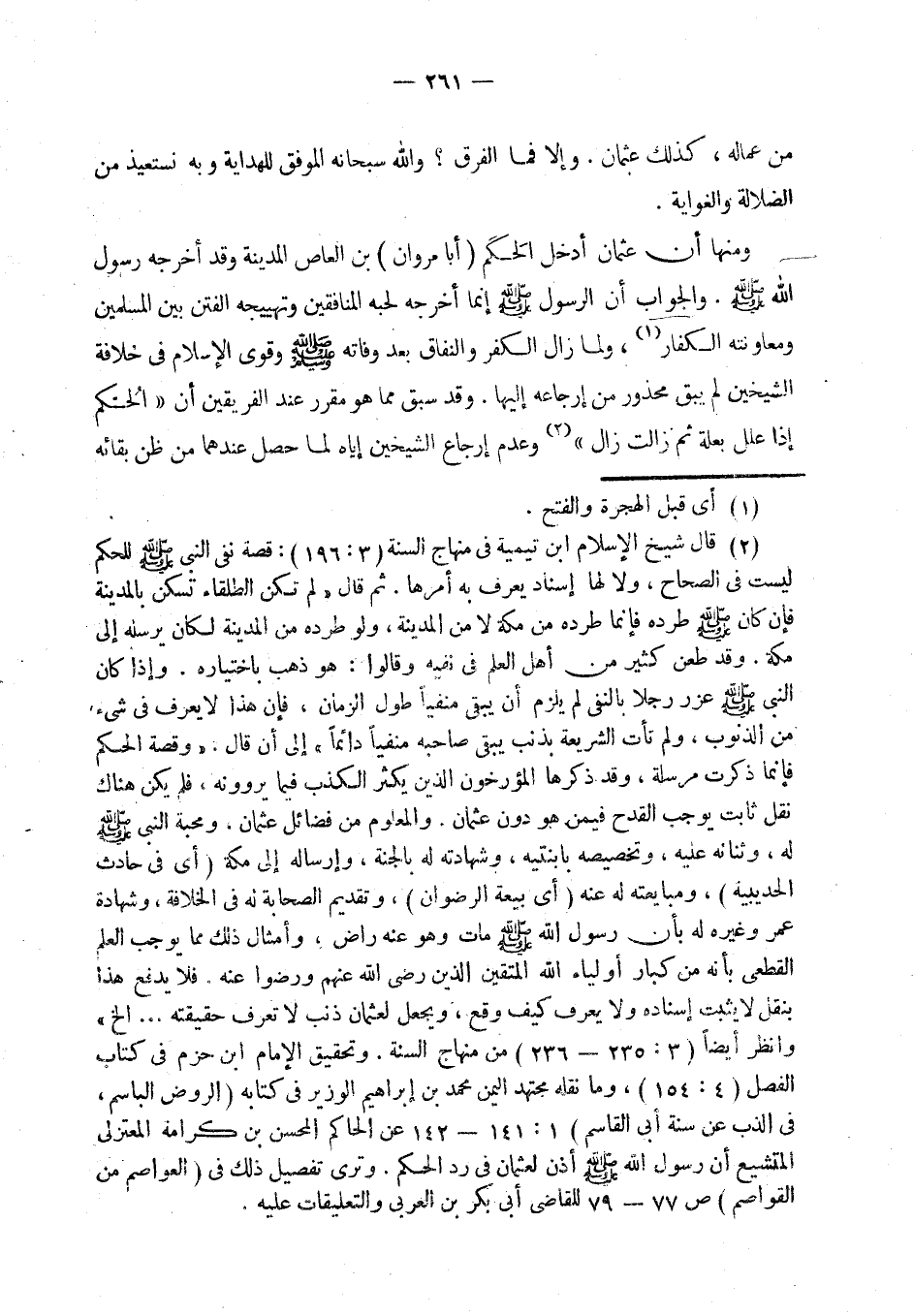 (¬1) الحكم بن أبي العاص بن أمية بن عبد شمس القرشي الأموي، عم عثمان بن عفان، أسلم يوم الفتح، مات سنة 32هـ. الإصابة: 2/ 104. وقال ابن تيمية: «قصة نفي النبي - صلى الله عليه وسلم - للحكم ليست من الصحاح، ولا لها إسناد يعرف به أمرها ... ولم تكن الطلقاء تسكن بالمدينة، فإن كان - صلى الله عليه وسلم - طرده فإنما طرده من مكة لا من المدينة، ولو طرده من المدينة لكان يرسله إلى مكة، وقد طعن كثير من أهل العلم في نفيه وقالوا: ذهب باختياره، وإذا كان النبي - صلى الله عليه وسلم - عزر رجلا بالنفي لم يلزم أن يبقى منفيا طول الزمان، فإن هذا لا يعرف بشيء من الذنوب، ولم تأت الشريعة بذنب يبقى صاحبه منفيا دائما». منهاج السنة النبوية: 6/ 226.