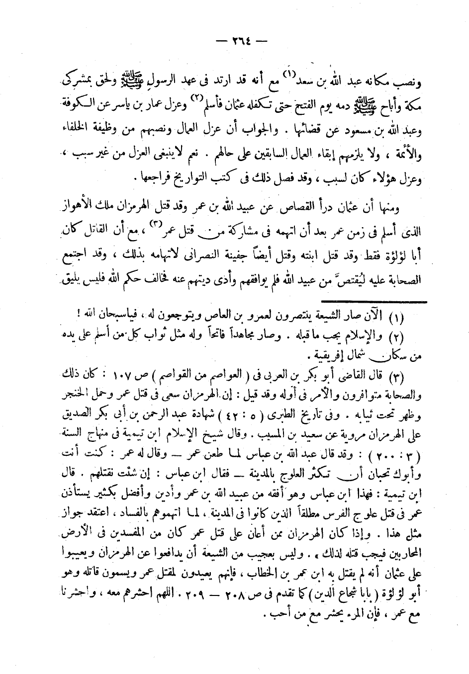 (¬5) قال القاضي أبو بكر بن العربي في (العواصم من القواصم) ص 107: كان ذلك والصحابة متوافرون والأمر في أوله وقد قيل: إن الهرمزان سعى في قتل عمر وحمل الخنجر وظهر تحت ثيابه. وفي تاريخ الطبري (5: 42) شهادة عبد الرحمن بن أبي بكر الصديق على الهرمزان مروية عن سعيد بن المسيب. وقال شيخ الإسلام ابن تيمية في منهاج السنة (3: 200): وقد قال عبد الله بن عباس لما طعن عمر - وقال له عمر: كنت أنت وأبوك تحبان أن تكثر العلوج بالمدينة - فقال ابن عباس: إن شيء ت نقتلهم. قال ابن تيمية: فهذا ابن عباس وهو أفقه من عبيد الله بن عمر وأدين وأفضل بكثير يستأذن عمر في قتل علوج الفرس مطلقا الذين كانوا في المدينة. لما اتهموهم بالفساد، اعتقدوا جواز مثل هذا. وإذا كان الهرمزان ممن أعان على قتل عمر كان من المفسدين في الأرض المحاربين فيجب أنه يقتل يعمر بن الخطاب، فإنهم يعيدون لمقتل عمر ويسمون قاتله وهو أبو لؤلؤة (بابا شجاع الدين)
