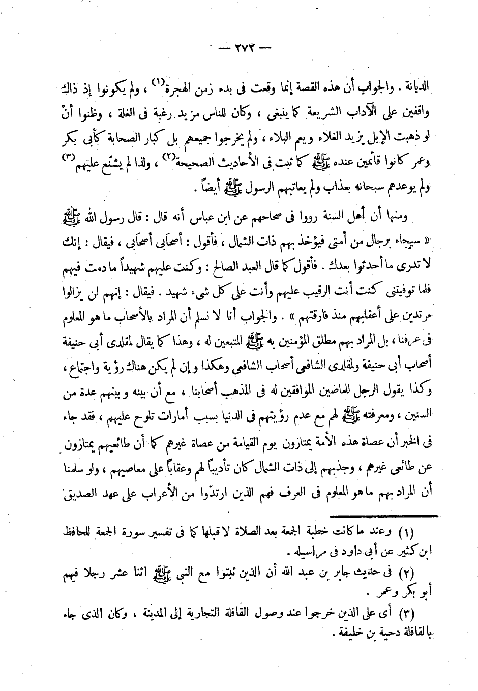 والجواب أنا لا نسلم أن المراد بالأصحاب ما هو المعلوم في عرفنا، بل المراد بهم مطلق المؤمنين به - صلى الله عليه وسلم - المتبعين له، وهذا كما يقال لمقلدي أبي حنيفة أصحاب أبي حنيفة ولمقلدي الشافعي أصحاب الشافعي وهكذا وإن لم يكن هناك رؤية واجتماع. وكذا يقول الرجل للماضين الموافقين له في مذهب أصحابنا، مع أن بينه وبينهم عدة من السنين. ومعرفته - صلى الله عليه وسلم - لهم مع عدم رؤيتهم في الدنيا بسبب أمارات تلوح عليهم، فقد جاء في الخبر أن عصاة هذه الأمة يمتازون يوم القيامة من عصاة غيرهم كما أن طائعيهم يمتازون عن طائعي غيرهم، وجذبهم إلى ذات الشمال كان تأديبا لهم وعقابا على معاصيهم. ولو سلمنا أن المراد بهم ما هو معلوم في العرف فهم الذين ارتدوا من الأعراب على عهد الصديق -