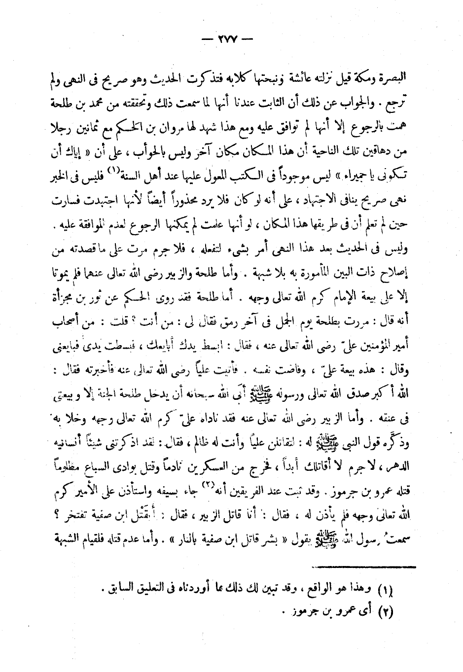 وأما طلحة والزبير رضي الله عنهما فلم يموتا إلا على بيعة الإمام كرم الله تعالى وجهه. أما طلحة فقد روى الحاكم (¬3) عن ثور بن مجزأة أنه قال: مررت بطلحة يوم الجمل في آخر رمق فقال لي: من أنت؟ قلت: من أصحاب أمير المؤمنين علي - رضي الله عنه -، فقال: ابسط يدك أبايعك، فبسطت يدي فبايعني وقال: هذه بيعة علي، وفاضت نفسه. فأتيت عليا - رضي الله عنه - فأخبرته فقال: الله أكبر صدق الله تعالى ورسوله - صلى الله عليه وسلم - أبى الله سبحانه أن يدخل طلحة الجنة إلا وبيعتي في عنقه. (¬4) وأما الزبير - رضي الله عنه - فقد ناداه علي كرم الله تعالى وجهه وخلا به وذكره قول النبي - صلى الله عليه وسلم - له: لتقاتلن عليا وأنت له ظالم، فقال: لقد أذكرتني شيئا أنسانيه الدهر، لا جرم، لا أقاتلك أبدا، (¬5) فخرج من العسكرين نادما وقتل بوادي السباع مظلوما قتله همرو بن جرموز. (¬6) وقد ثبت عند الفريقين أنه (¬7) جاء بسيفه واستاذن على الأمير كرم الله تعالى وجهه فلم يأذن له، فقال: أنا قاتل الزبير، فقال: أبقتل ابن صفية تفتخر؟ سمعت رسول الله - صلى الله عليه وسلم - يقول «بشر قاتل ابن صفية بالنار». (¬8)