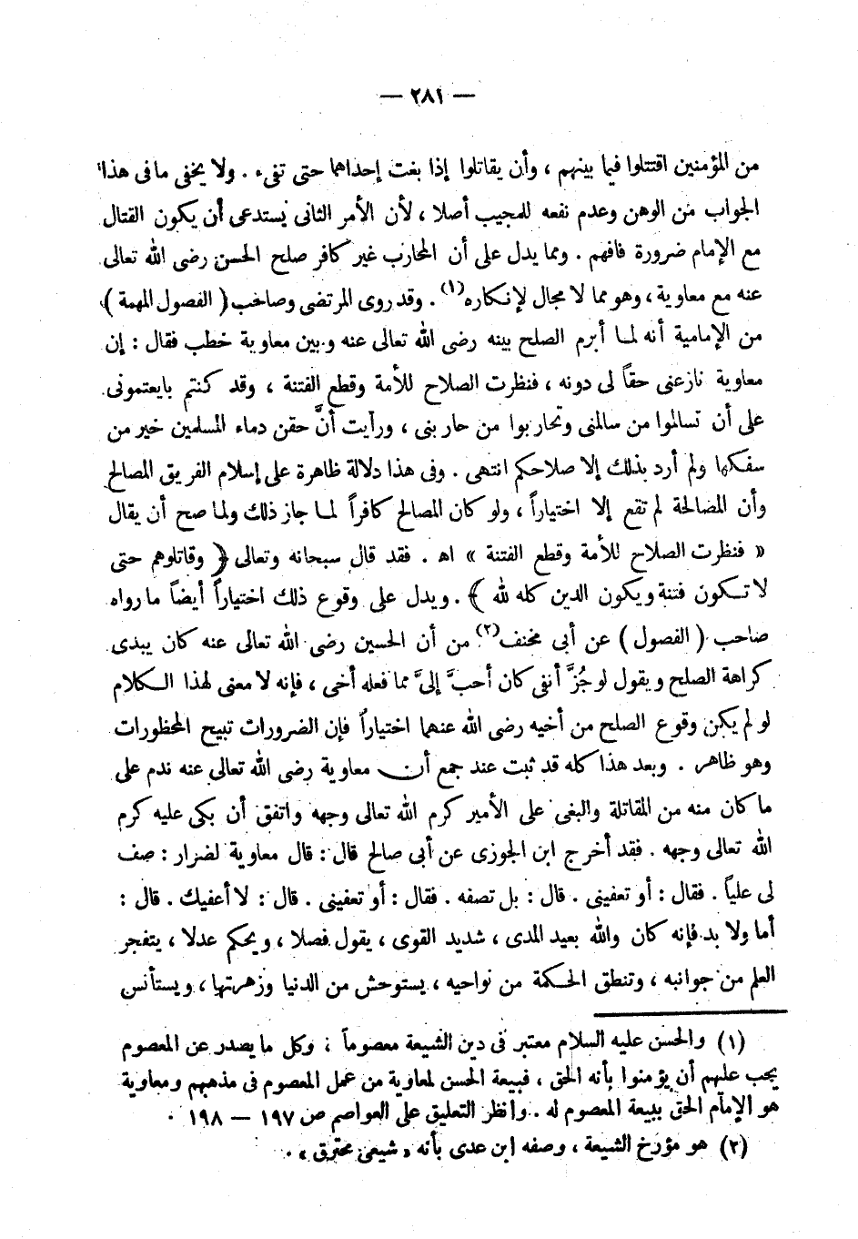 (¬2) والحسن - عليه السلام - معتبر في دين الشيعة معصوما، وكل ما يصدر عن المعصوم يجب عليهم أن يؤمنوا بأنه الحق، فبيعة الحسن لمعاوية من عمل المعصوم في مذهبهم ومعاوية هو الإمام الحق ببيعت المعصوم له. وانظر التعليق على العواصم ص 197 - 198.