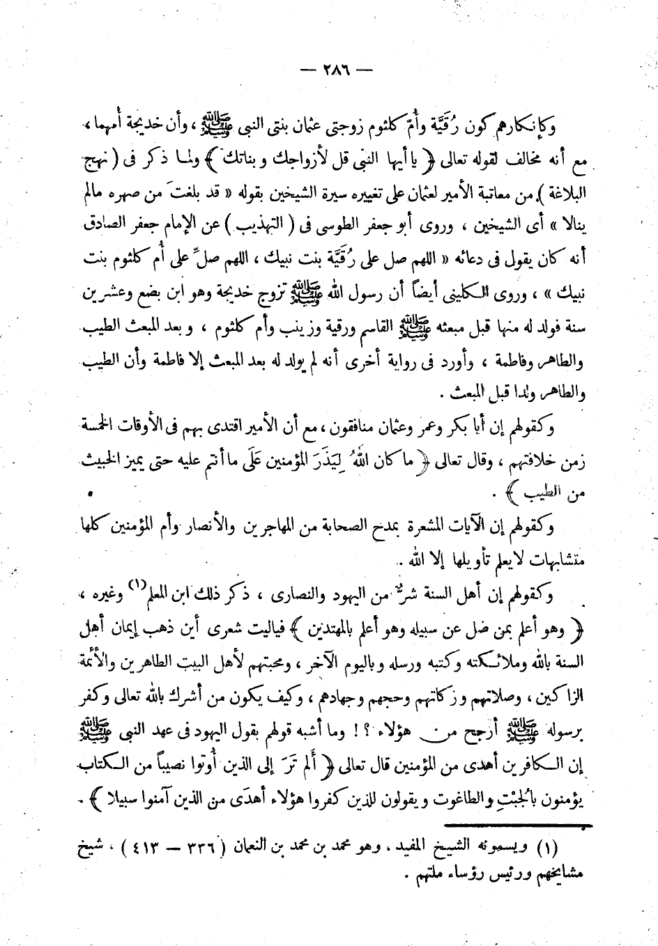 وكإنكارهم كون رقية وأم كلثوم زوجتي عثمان بنتي النبي - صلى الله عليه وسلم - وأن خديجة أمهما. (¬1) مع أنه مخالف لقوله تعالى {يا أيها النبي قل لأزواجك وبناتك} ولما ذكر في (نهج البلاغة) من معاتبة الأمير لعثمان على تغييره سيرة الشيخين بقوله «قد بلغت من صهره ما لم ينالا» (¬2) أي الشيخين. وروى أبو جعفر الطوسي في (التهذيب) عن الإمام جعفر الصادق أنه كان يقول في دعائه «اللهم صل على رقية بنت نبيك، اللهم صل على أم كلثوم بنت نبيك». (¬3) وروى الكليني أيضا أن رسول الله - صلى الله عليه وسلم - تزوج خديجة وهو ابن بضع وعشرين سنة فولد منها قبل مبعثه - صلى الله عليه وسلم - «القاسم ورقية وزينب وأم كلثوم، وبعد المبعث الطيب والطاهر وفاطمة». (¬4) وأورد في رواية أخرى أنه لم يولد له بعد المبعث إلا فاطمة وأن الطيب والطاهر ولدا قبل المبعث.