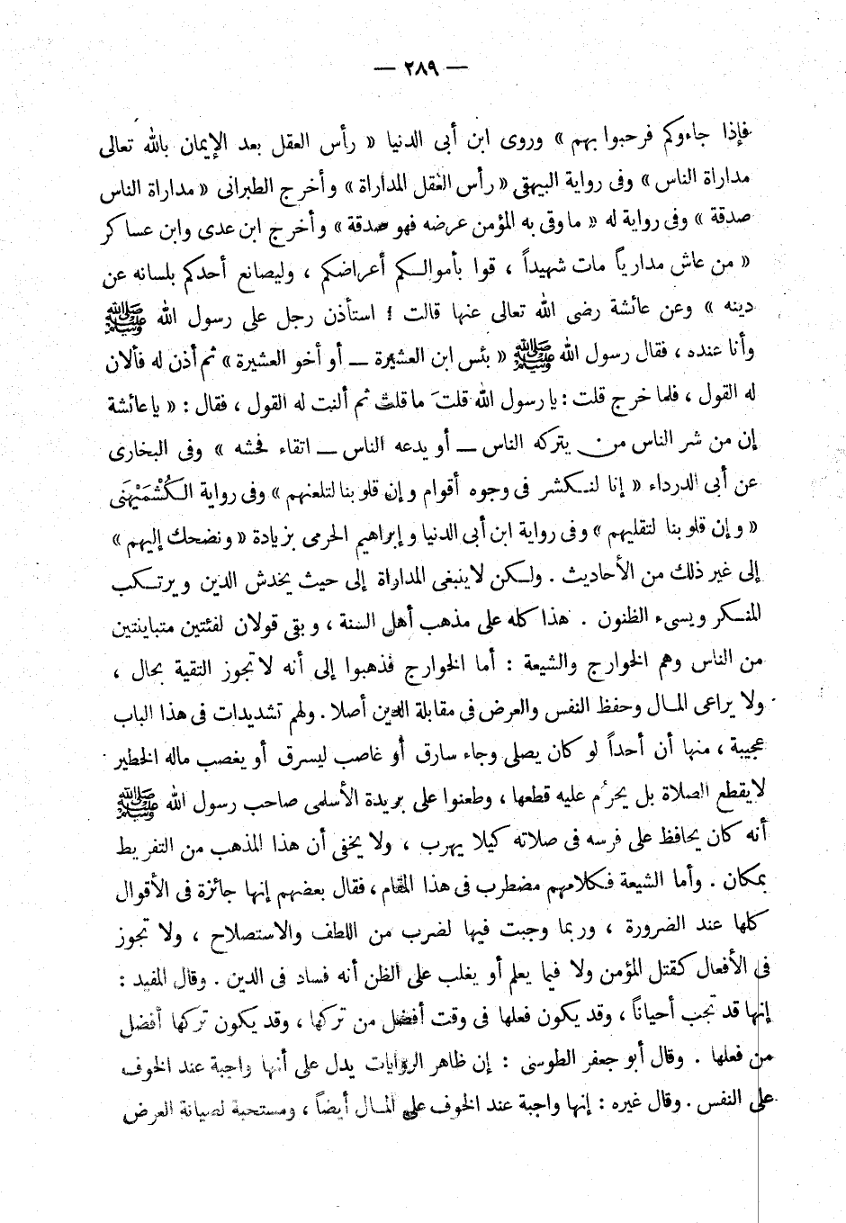 ولكن لا ينبغي المداراة إلى حيث يخدش الدين ويرتكب المنكر ويسيء الظنون. هذا كله على مذهب أهل السنة، وبقي قولان لفئتين متباينتين من الناس وهم الخوارج والشيعة: