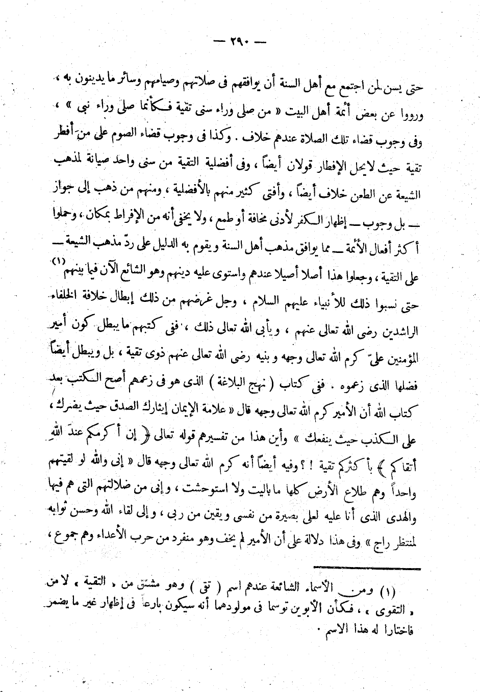 حتى يسن لمن اجتمع مع أهل السنة أن يوافقهم في صلاتهم وصيامهم وسائر ما يدينون به. ورووا عن بعض ائمة أهل البيت «من صلى وراء سني تقية فكأنما صلى وراء نبي». (¬1) وفي وجوب قضاء تلك الصلاة عندهم خلاف. وكذا في وجوب قضاء الصوم على من أفطر تقية حيث لا يحل الإفطار قولان أيضا. (¬2) وفي أفضلية التقية من سني واحد صيانة لمذهب الشيعة عن الطعن خلاف أيضا. وأفتى كثير منهم بالأفضلية، ومنهم من ذهب إلى جواز - بل وجوب - إظهار الكفر لأدنى مخافة أو طمع، ولا يخفى أنه من الإفراط بمكان. وحملوا أكثر أفعال الأئمة - مما يوافق مذهب أهل السنة ويقوم به الدليل على رد مذهب الشيعة - على التقية، وجعلوا هذا أصلا أصيلا واستوى عليه دينهم وهو الشائع الآن فيما بينهم. (¬3) حتى نسبوا ذلك للأنبياء عليهم السلام، (¬4) وجل غرضهم من ذلك إبطال خلافة الخلفاء الراشدين رضي الله تعالى عنهم، ويأبى الله تعالى ذلك، ففى كتبهم ما يبطل كون أمير المؤمنين علي كرم الله تعالى وجهه ونبيه - رضي الله عنه - ذوى تقية، بل ويبطل أيضا فضلها الذي زعموه.