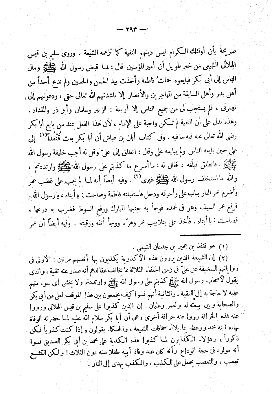 وروى سليم بن قيس الهلالي الشيعي من خبر طويل أن أمير المؤمنين قال: «لما قبض رسول الله - صلى الله عليه وسلم - ومال الناس إلى أبي بكر فبايعوه حملت فاطمة وأخذت بيد الحسن والحسين ولم تدع أحدا من أهل بدر وأهل السابقة من المهاجرين والأنصار إلا ناشدتهم الله تعالى حقي ودعوتهم إلى نصرتي، فلم يستجب لي من جميع الناس إلا أربعة: الزبير وسلمان وأبو ذر والمقداد.» (¬1) وهذه تدل على أن التقية لم تكن واجبة على الإمام، لأن هذا الفعل عند من بايع أبا بكر - رضي الله عنه - فيه ما فيه.